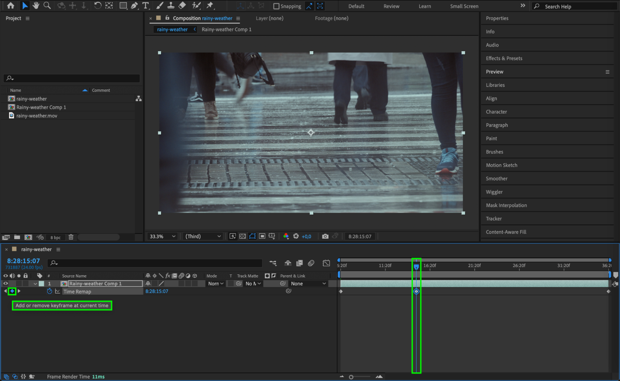 Time remapping is the key feature for creating loops. Right-click on the pre-composed layer and go to Time > Enable Time Remapping. Time remapping creates keyframes that allow you to control the timing of your video, crucial for setting the loop points. Once enabled, you’ll see keyframes appear on the timeline, indicating where the video begins and ends.