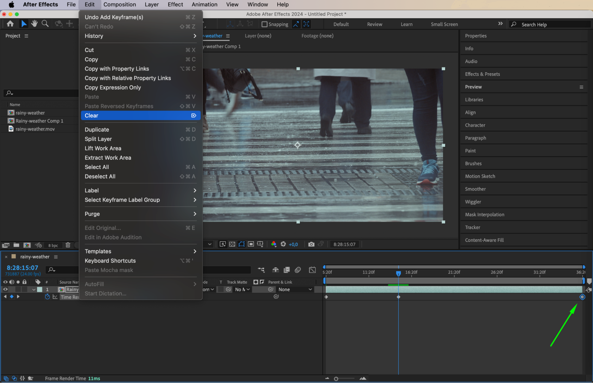 Now, decide where you want the video to loop. Move the Current Time Indicator (CTI) to the desired loop endpoint in the timeline and add a keyframe by clicking the diamond next to the Time Remap property. Then, delete the automatically generated second keyframe by selecting it and pressing Delete. This process helps in creating a smooth start and end point for the loop without sudden jumps.