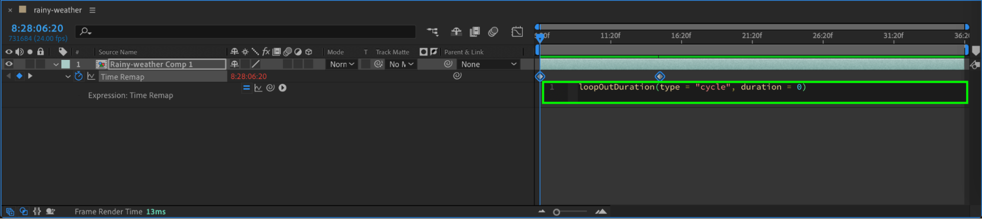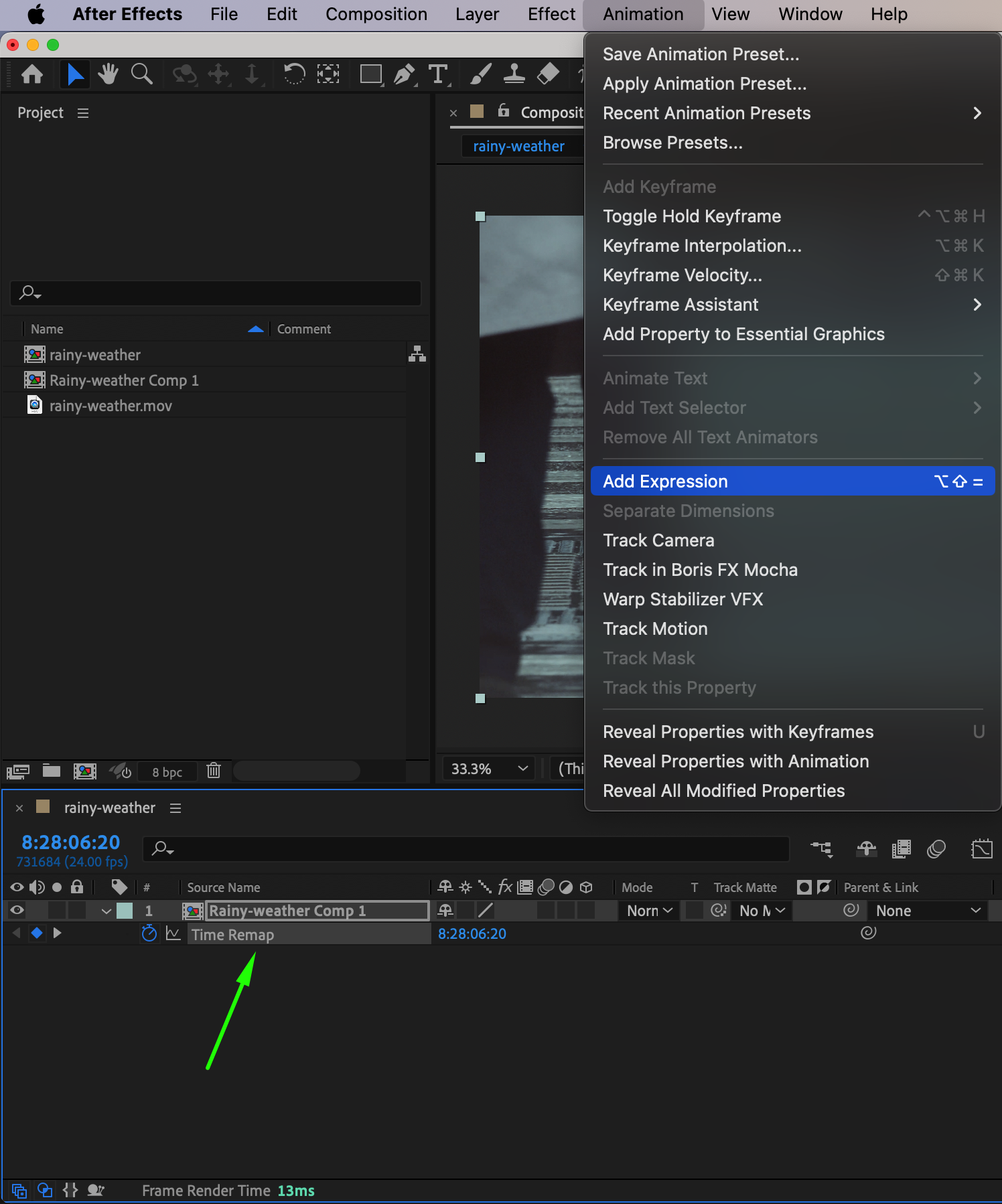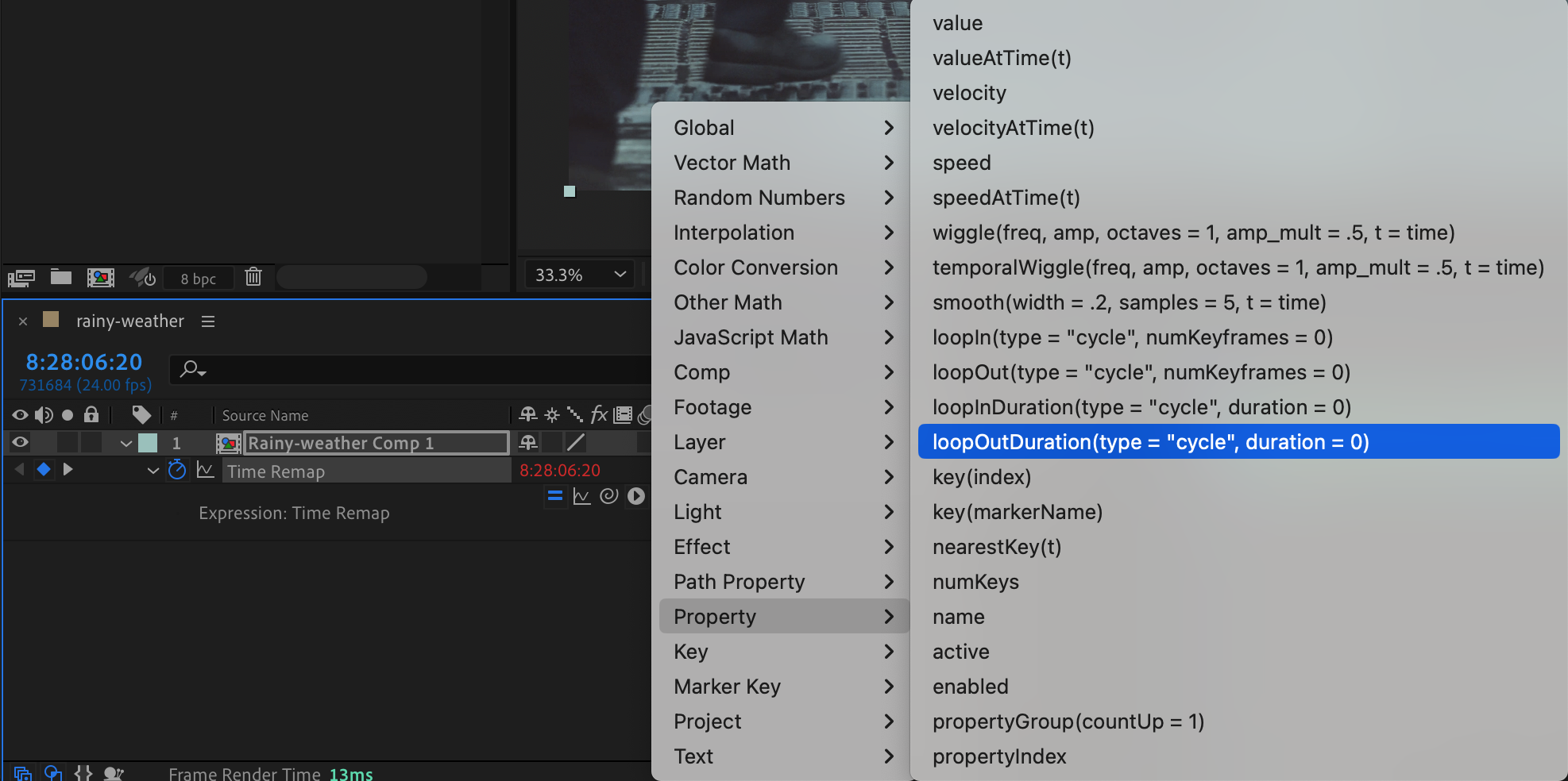 Next, you’ll add an expression to create the looping effect. Click on the Time Remap property, go to Animation > Add Expression, and a code box will appear in the timeline. Click the small triangle next to the expression box and choose Property > loopOutDuration from the submenu. Press Enter to apply the expression. This function tells After Effects to loop the video smoothly based on the start and end points you’ve defined.