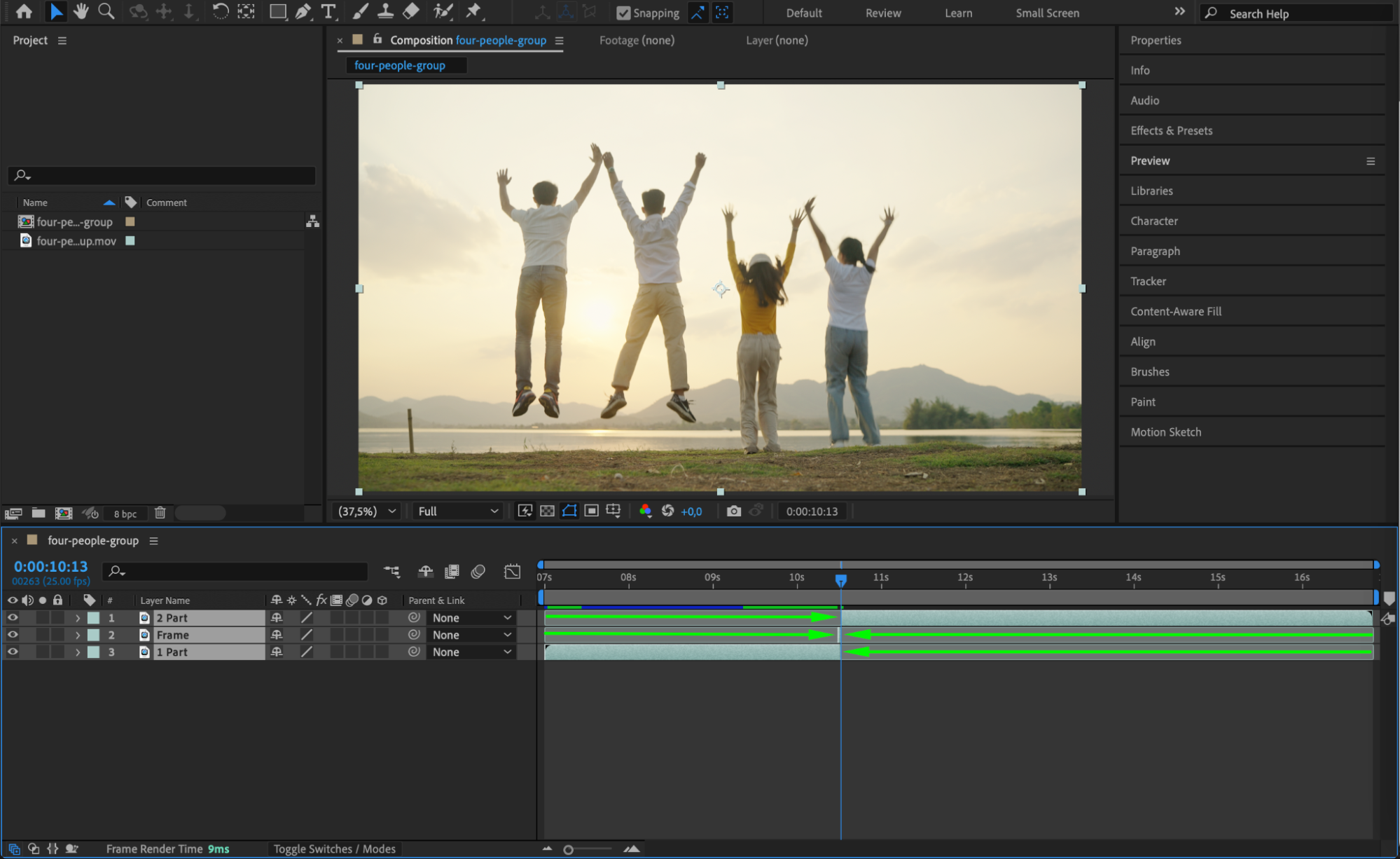 Drag the end of the Frame layer to extend its duration as needed. Then, reposition the 2 Part layer so that it starts immediately after the frozen frame, ensuring a seamless transition.