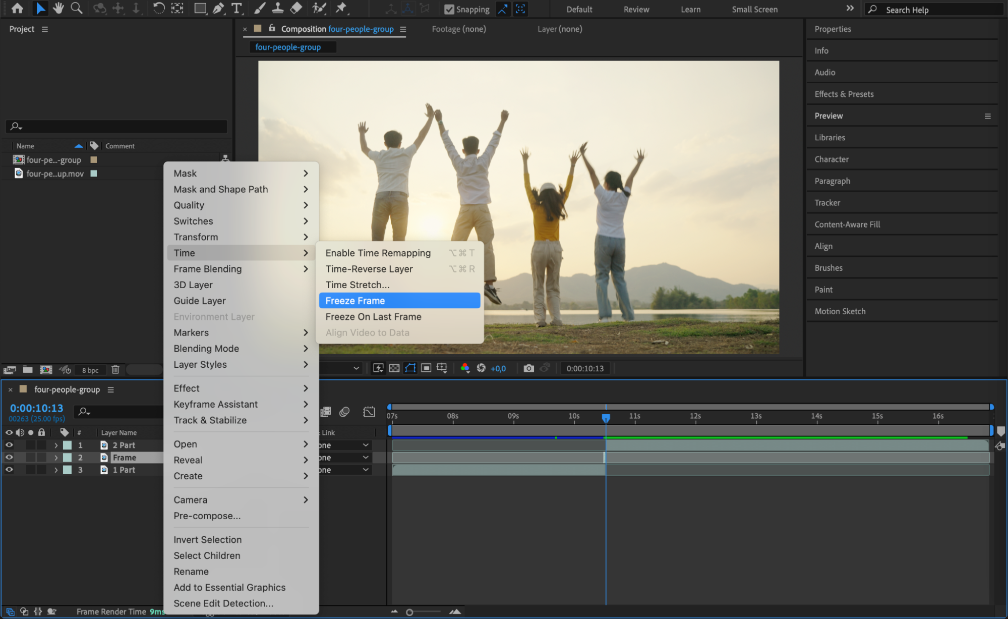 Right-click on the Frame layer, go to Time > Freeze Frame. This locks the selected frame in place, creating a still image that appears as a pause in the video.