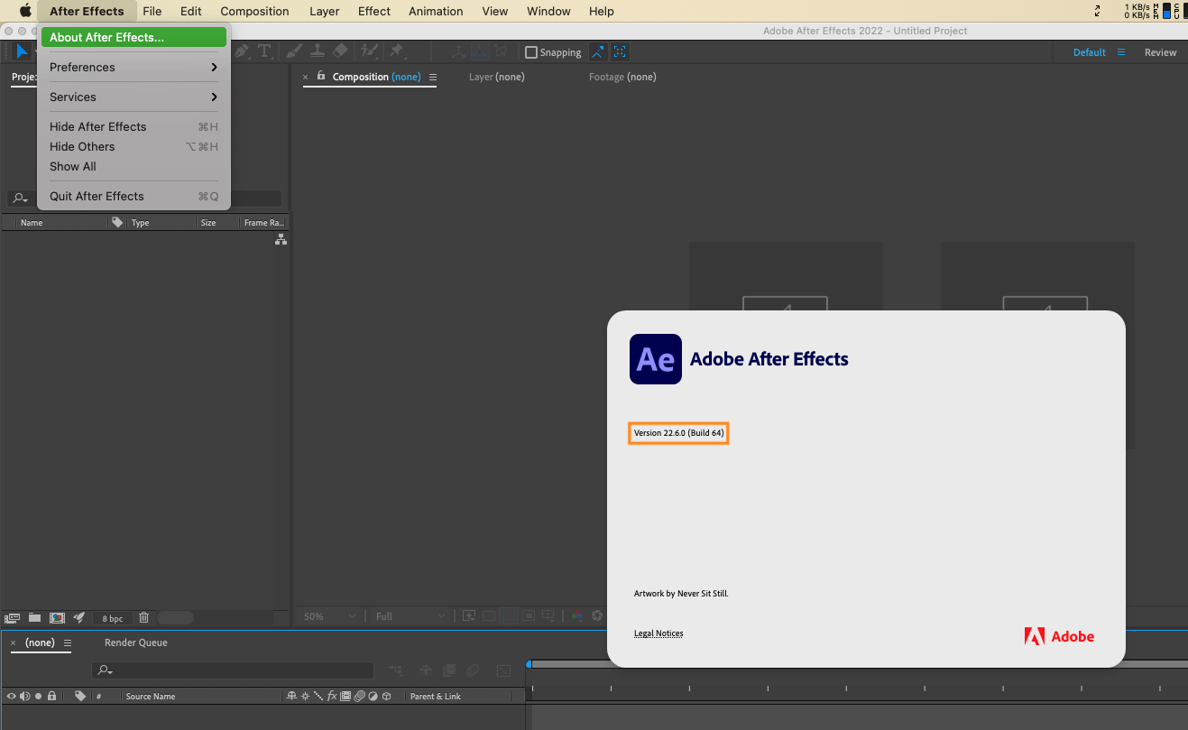 Adobe frequently releases updates for After Effects, and these updates often include performance improvements and bug fixes. Make sure you have the latest version installed to take advantage of these enhancements. To find out your version of After Effects, open it and click on After Effects (Help) > About After Effects. In the pop-up window, you’ll see the After Effects version number and the build number.