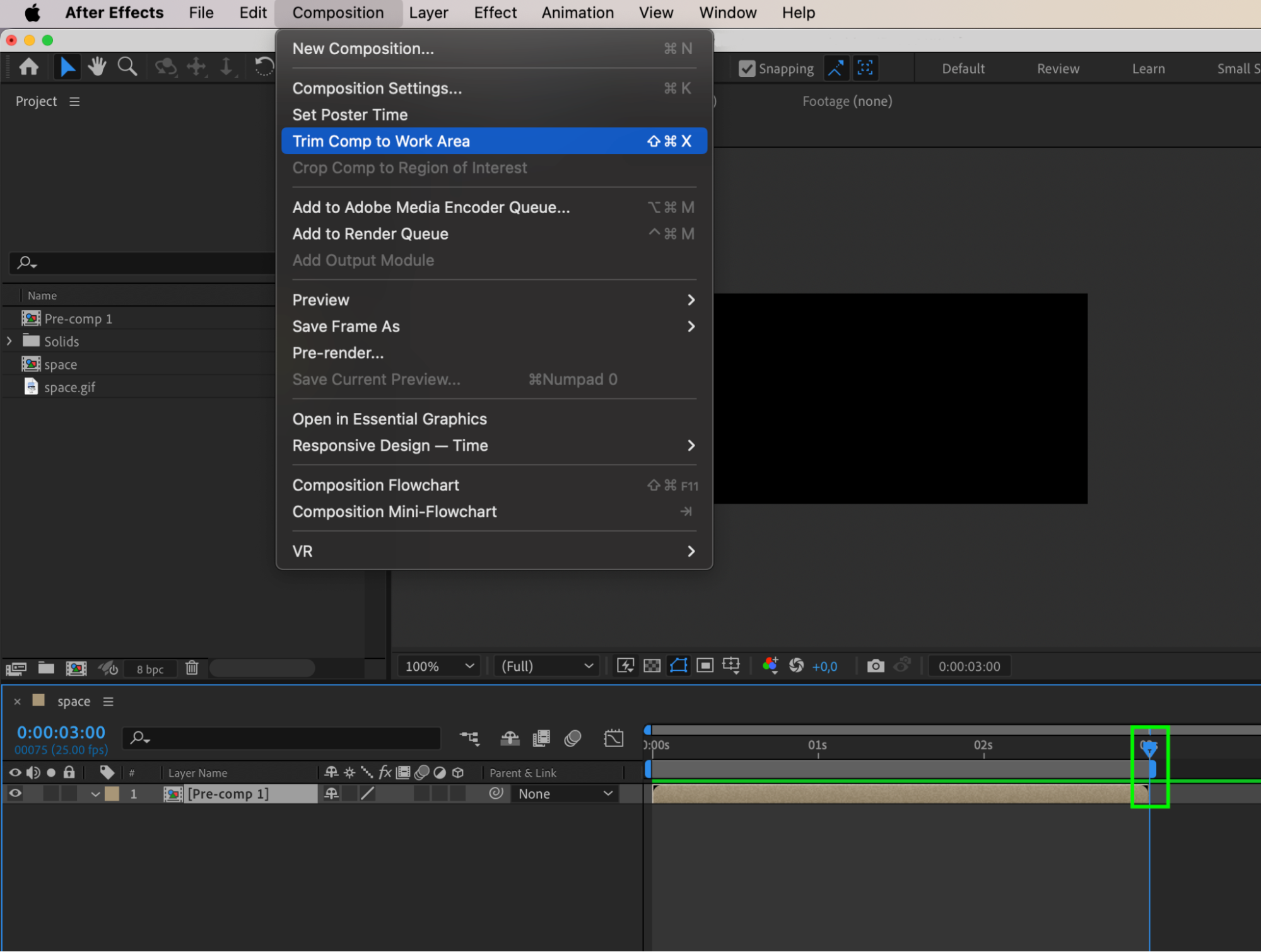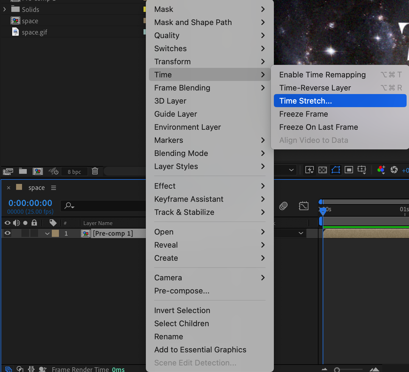 If you want to make your GIF shorter, select all the layers and right-click to choose Pre-compose. After pre-composing, right-click the pre-comp layer and choose Time > Time Stretch. Enter a new stretch factor value and click OK. Adjust the work area end slider and navigate to Composition > Crop Comp to Work Area to trim the composition.