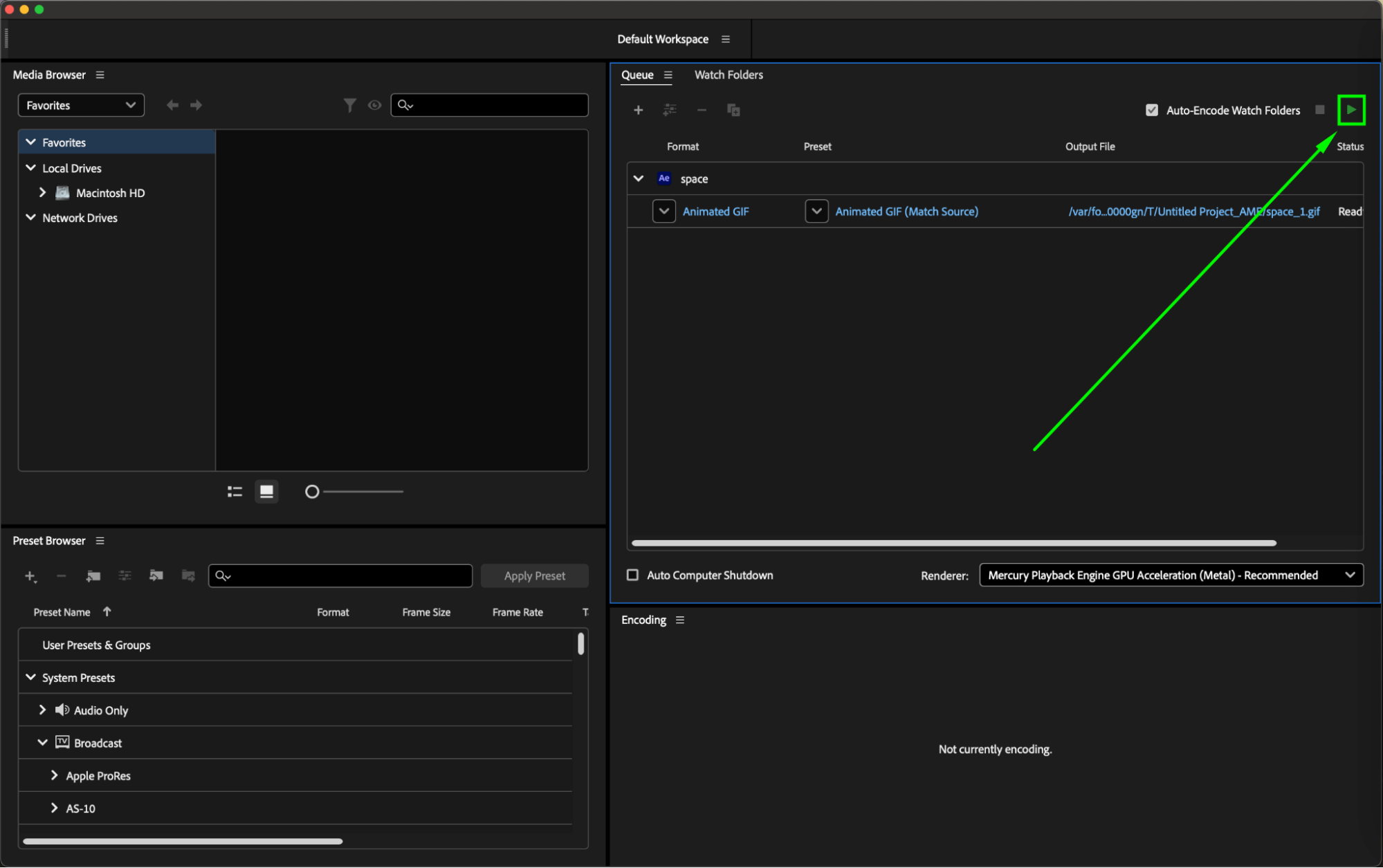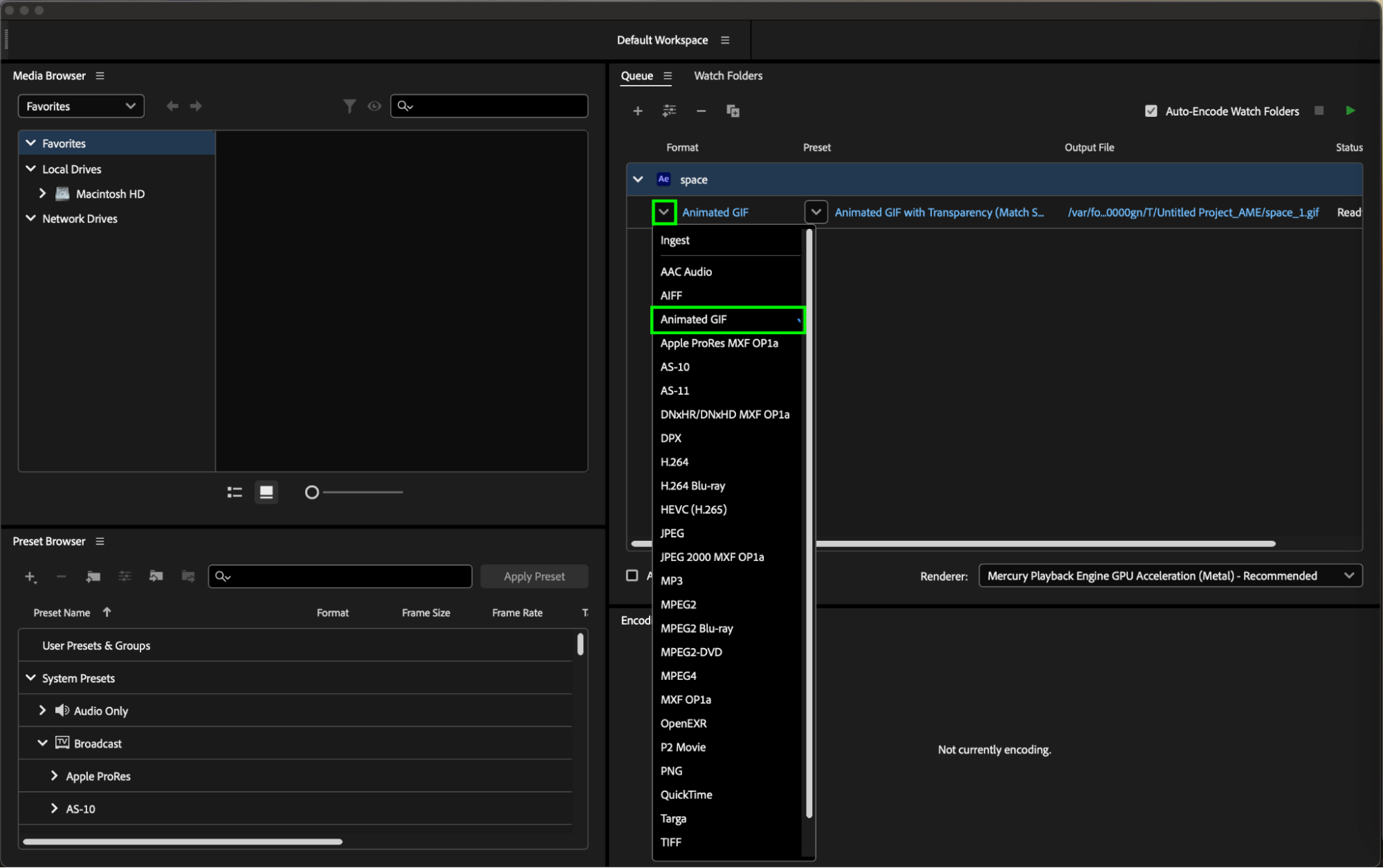 To export your animation as a GIF, select the composition in the project panel and go to Composition > Add to Adobe Media Encoder Queue. In Adobe Media Encoder, choose the correct format and preset for GIF. Press the Start Queue (play) button to begin the rendering process.