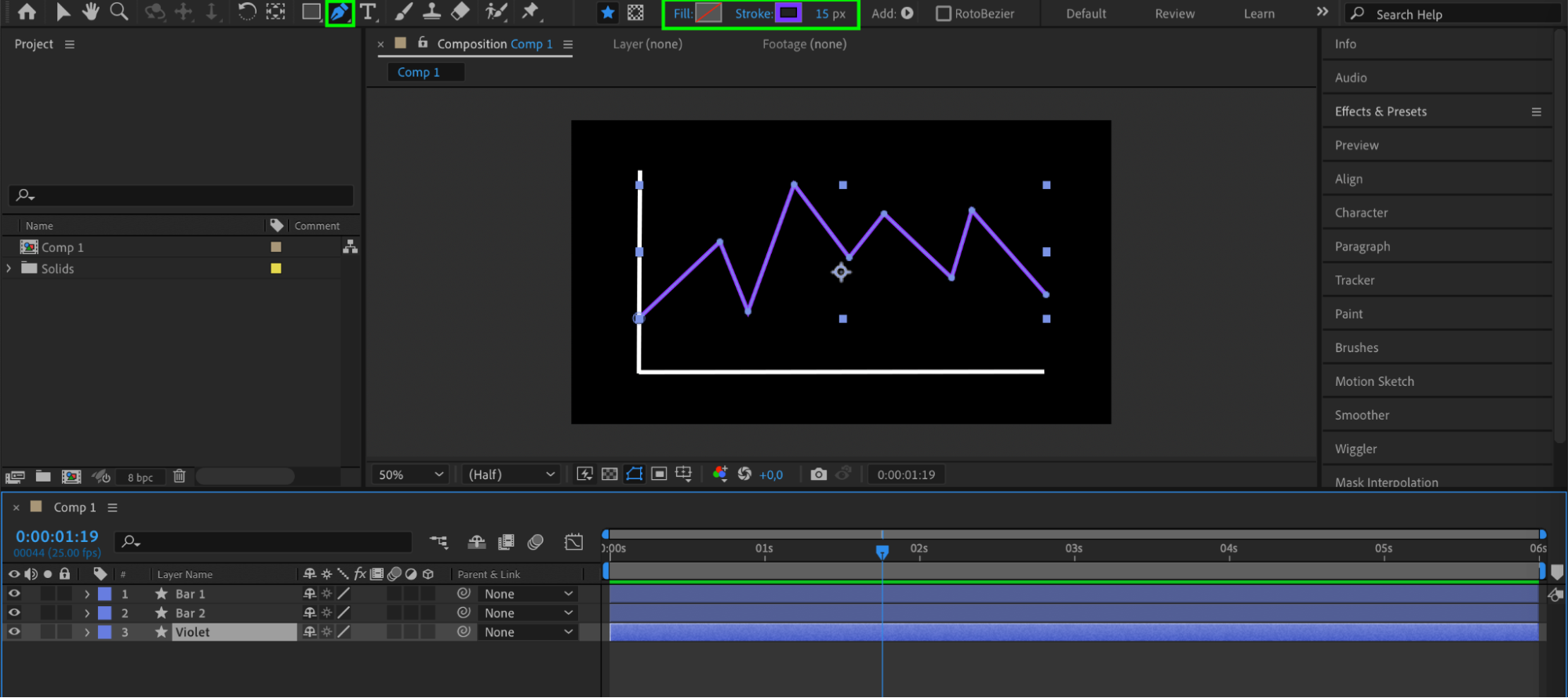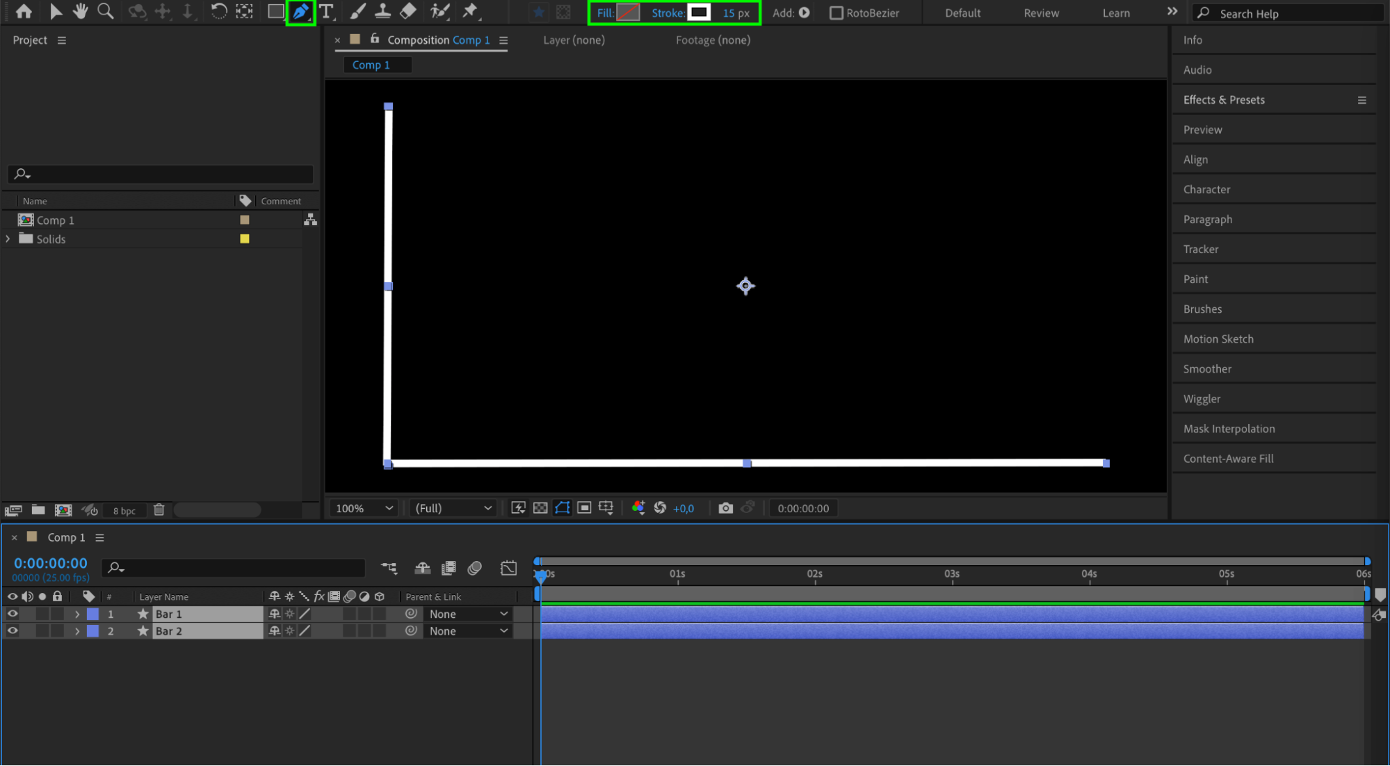 Use the Pen Tool (G) to draw Bar 1 and Bar 2 separately, ensuring each can be animated independently. Above the composition panel, customize the stroke color and pixel width to suit your design.