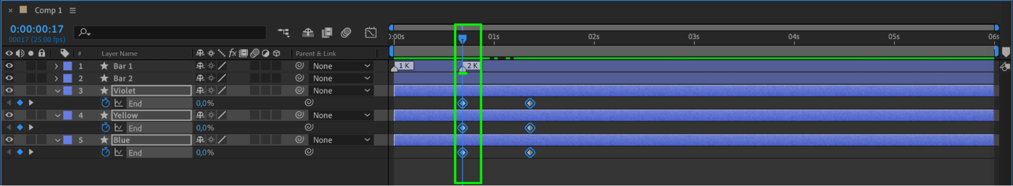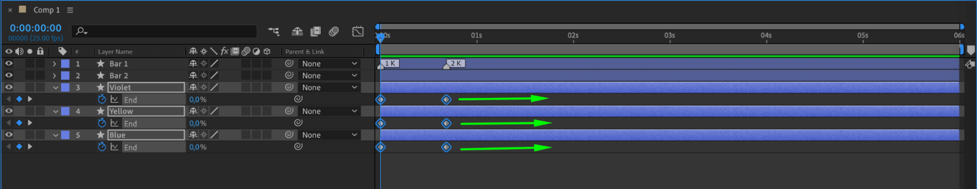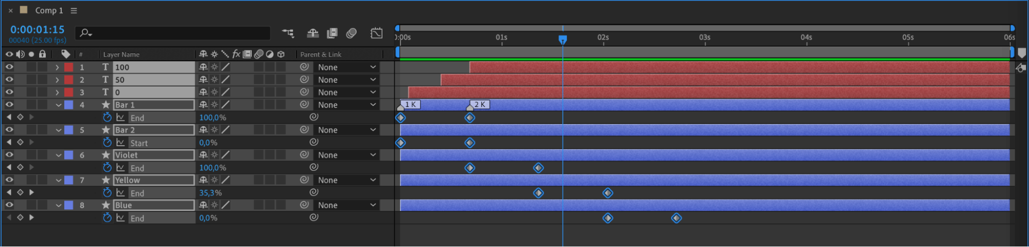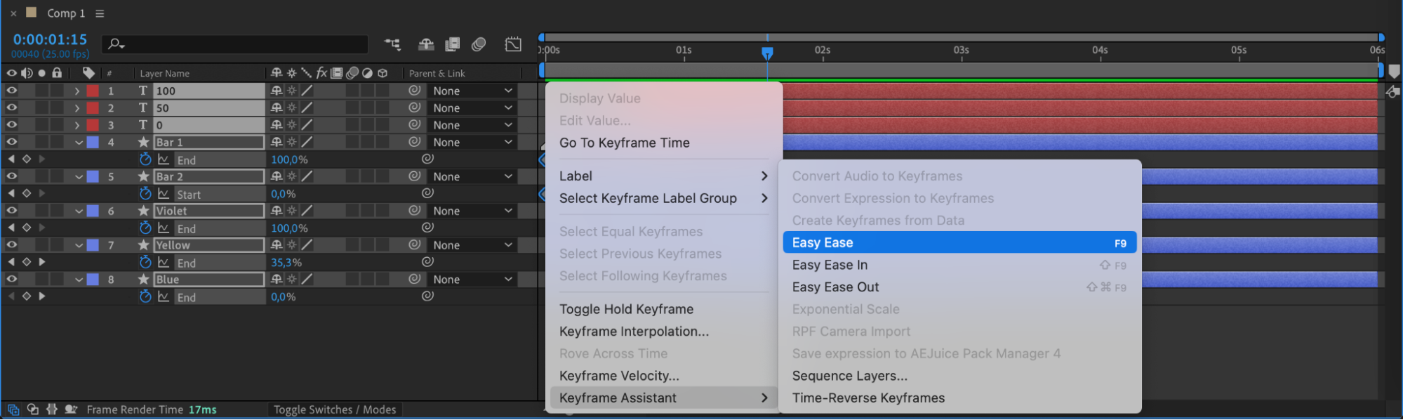 Select all created layers and use the shortcut “U” to display all keyframes. Right-click on the keyframes and choose Keyframe Assistant > Easy Ease to smooth out the animations.