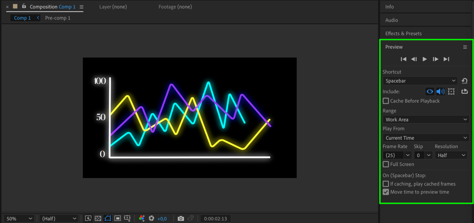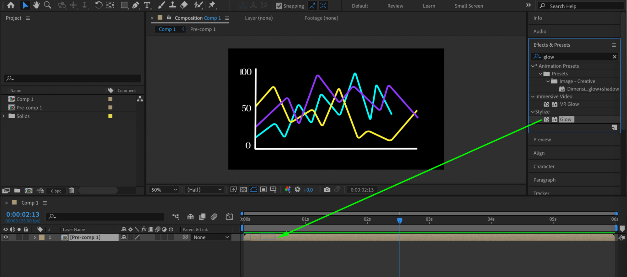 Once your graph is complete, select all layers and pre-compose them for easier management. You can then apply various effects from the Effects & Presets panel to the pre-composition for additional styling.