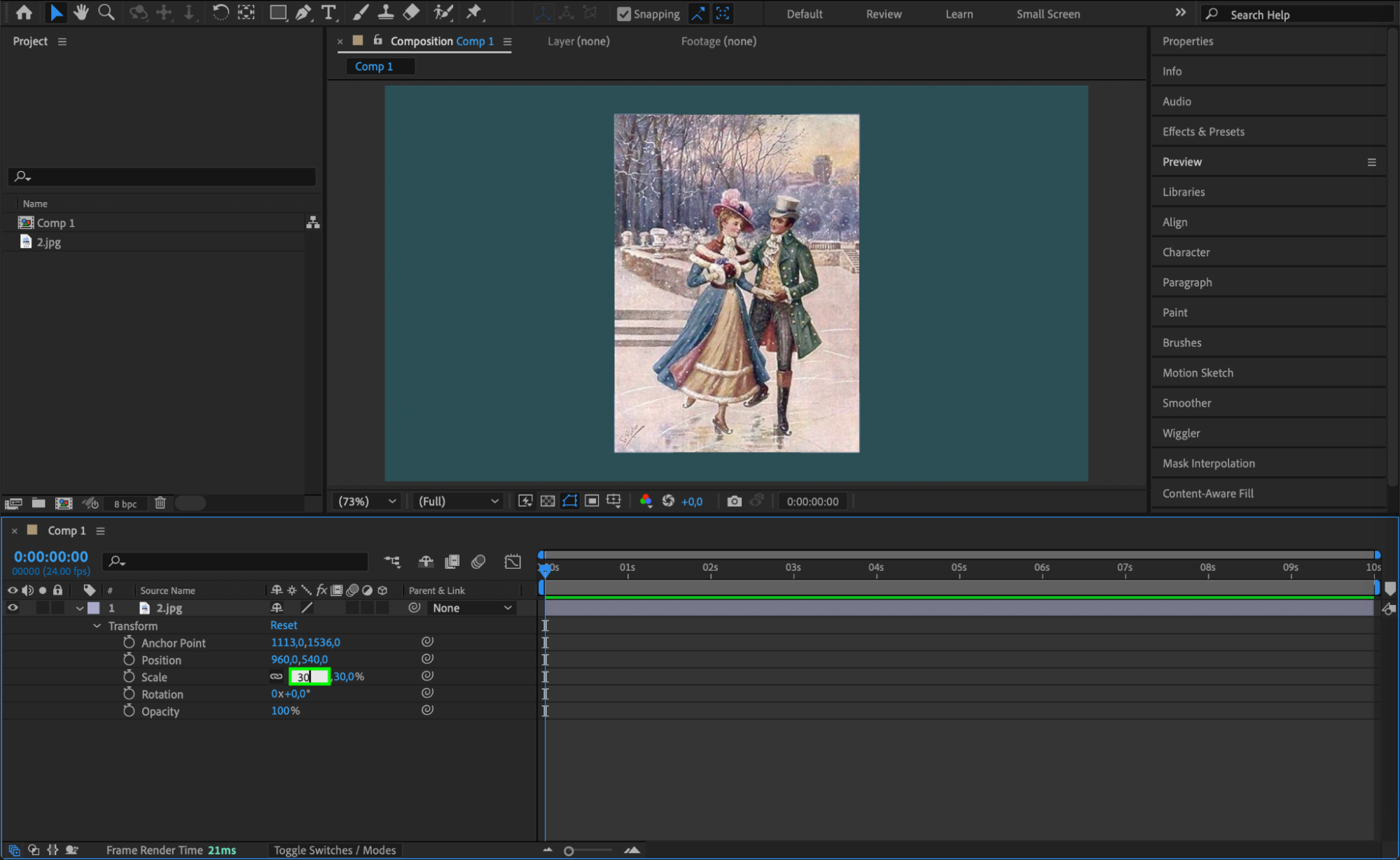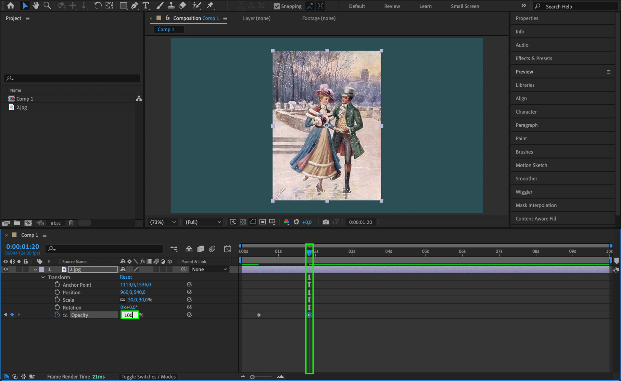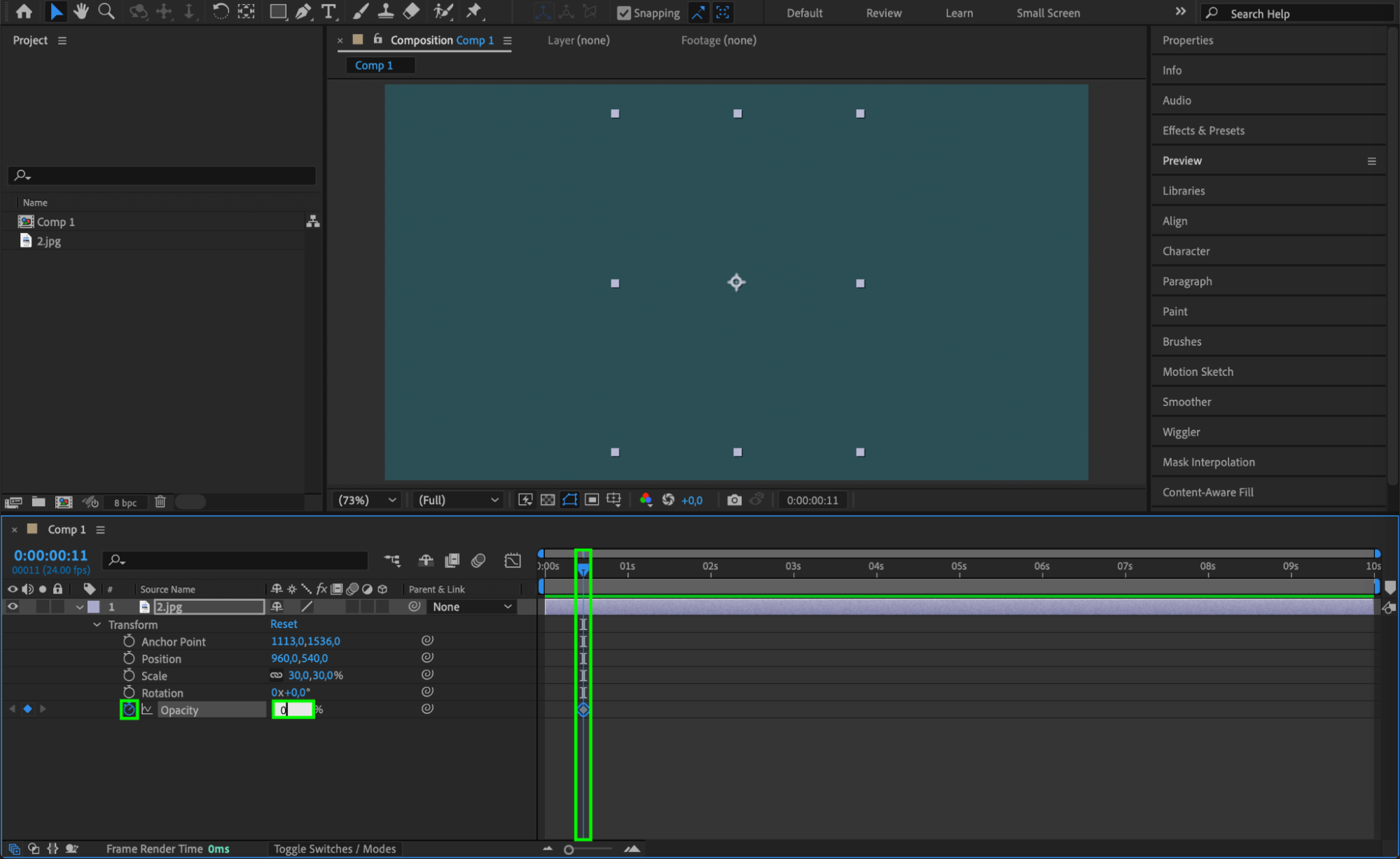 Press the Spacebar to preview the animation. Check if the timing and smoothness of the image’s appearance meet your expectations. Adjust keyframes as needed to refine the transitions.