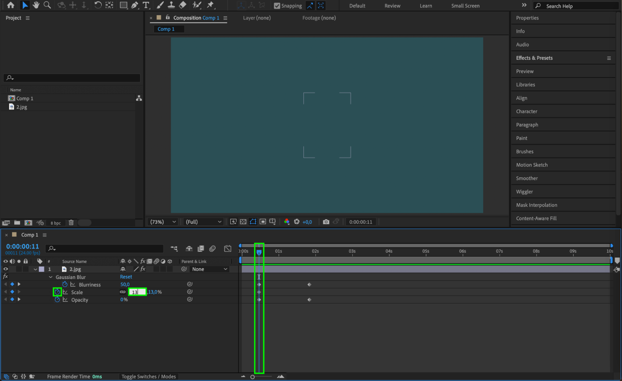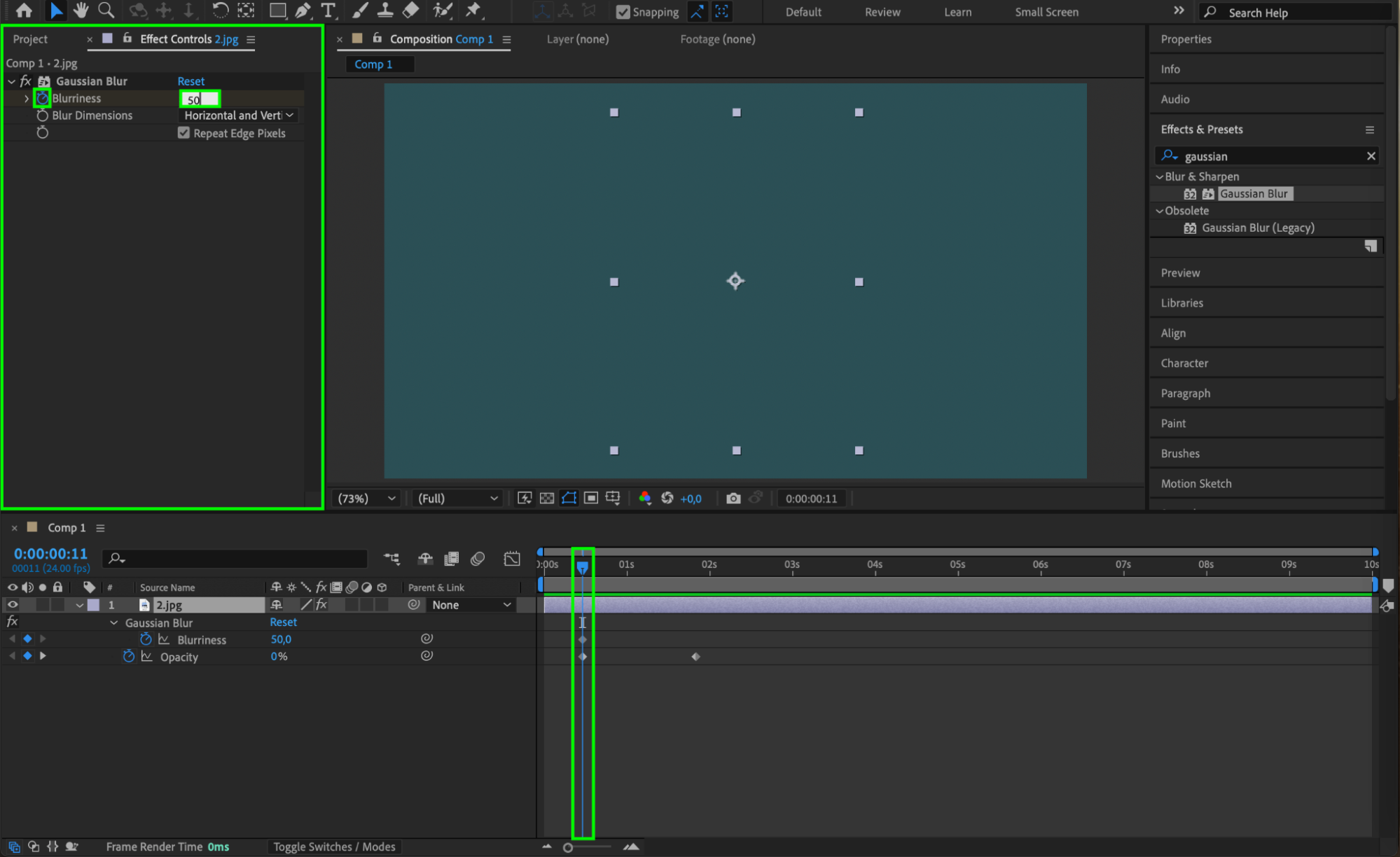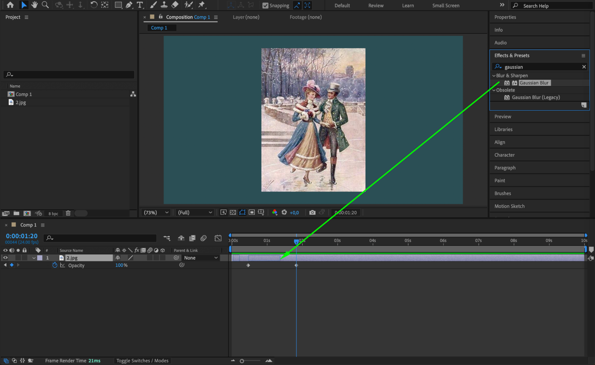 To make the appearance more dynamic, add a blur effect. Select the image layer, go to Effects & Presets Panel, and search for Gaussian Blur. Drag and drop the effect onto the image layer.