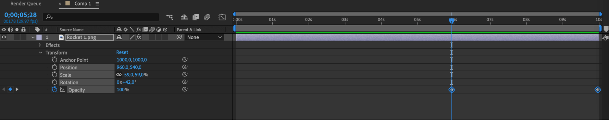 Set the initial opacity value of the object to 100% in the middle of the timeline and 0% at the end. This will create the fading effect of the object as the composition plays.