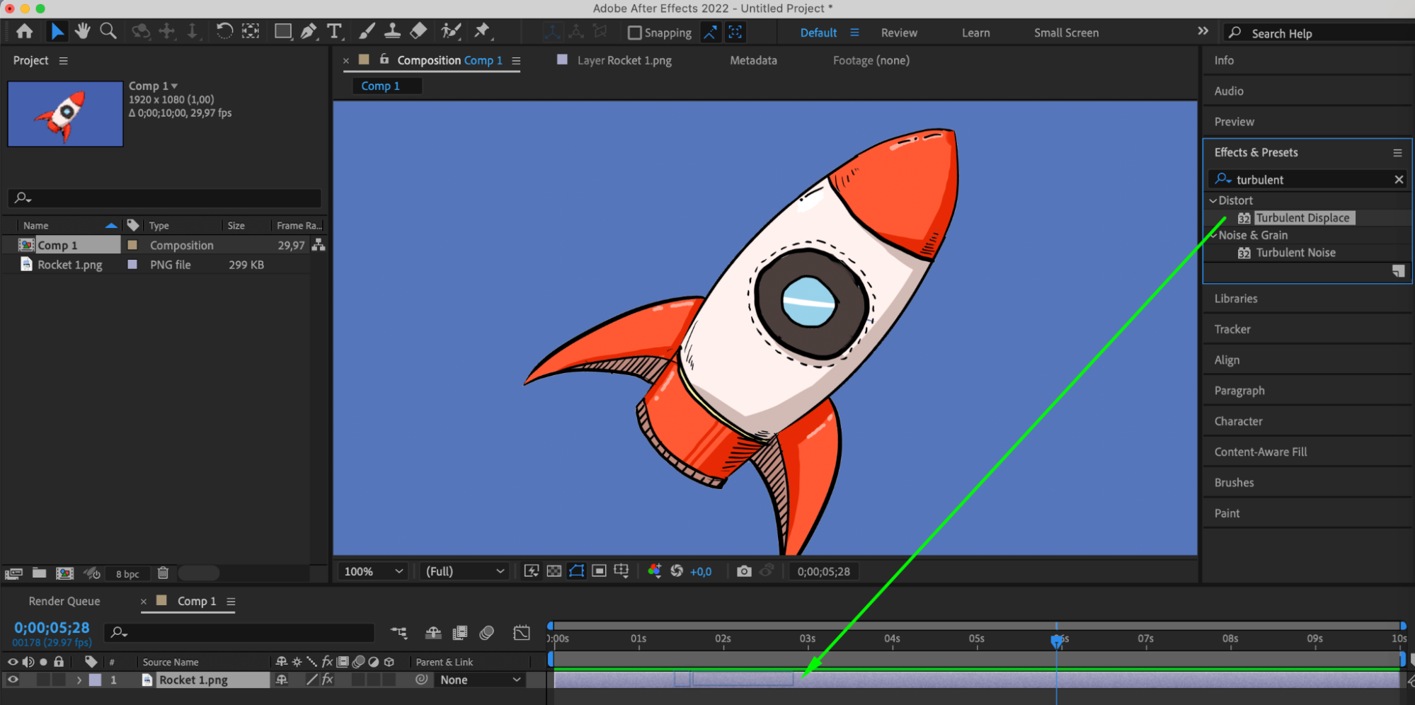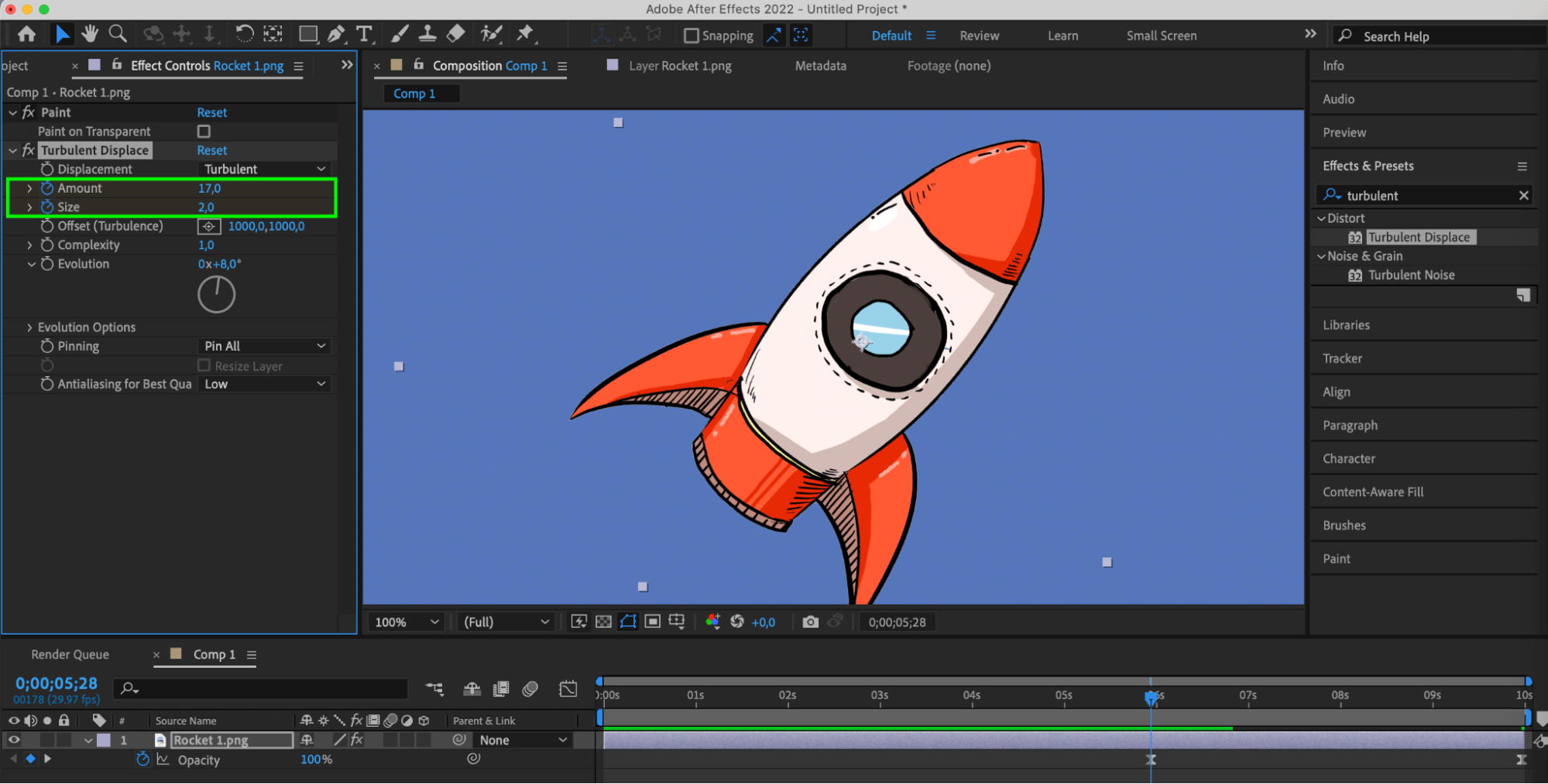 Experiment with different effects and blending modes to enhance the visual impact of the effect. For example, you can apply the Turbulent Displace effect from the Effects & Presets panel to give the object additional texture or movement before fading out.