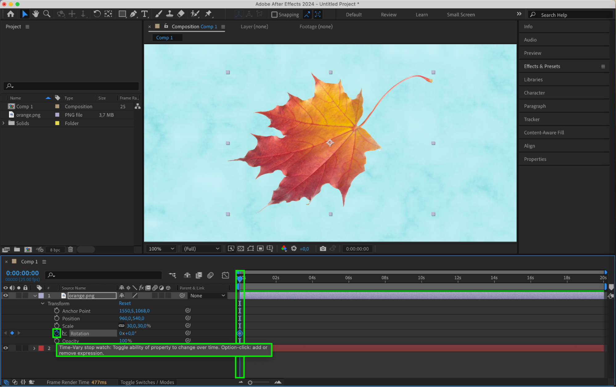 Keyframing is a powerful technique in After Effects. To make an object spin using keyframes, select the layer you want to animate in the timeline. Expand the layer properties and find the rotation parameter, or press “R” to reveal it. Set a keyframe at the starting point of your animation, then move to a later point in the timeline and change the rotation value. After Effects will automatically animate the rotation between the two keyframes. You can fine-tune the timing and rotation values for a smooth and controlled spin effect. For more precision, use the Graph Editor to adjust the motion curves.