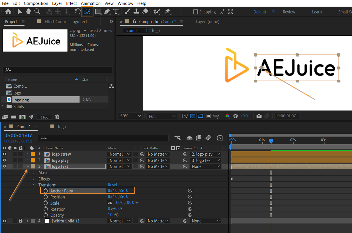 4. Experiment with anchor points and scale: To pivot or rotate your logo, use the hotkey “A” to reveal the anchor point property. Adjust the anchor point to the desired pivot point for your logo’s rotation using the Anchor Point Tool or the hotkey “Y”. Additionally, you can use the hotkey “S” to reveal the scale property and animate the size of your logo over time.
