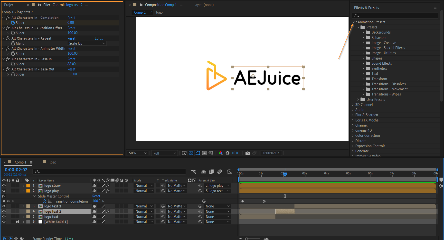 6. Polish with transitions and text animations: To add a professional touch to your logo animation, incorporate transitions and text animations. Utilize effects like “Slide” or “Fade” to smoothly introduce or exit your logo. For text animations, use the hotkey “Ctrl+Shift+D” (or “Cmd+Shift+D”) to split your logo layer, apply the text animation to the new text layer, and customize it using the Effect Controls panel.