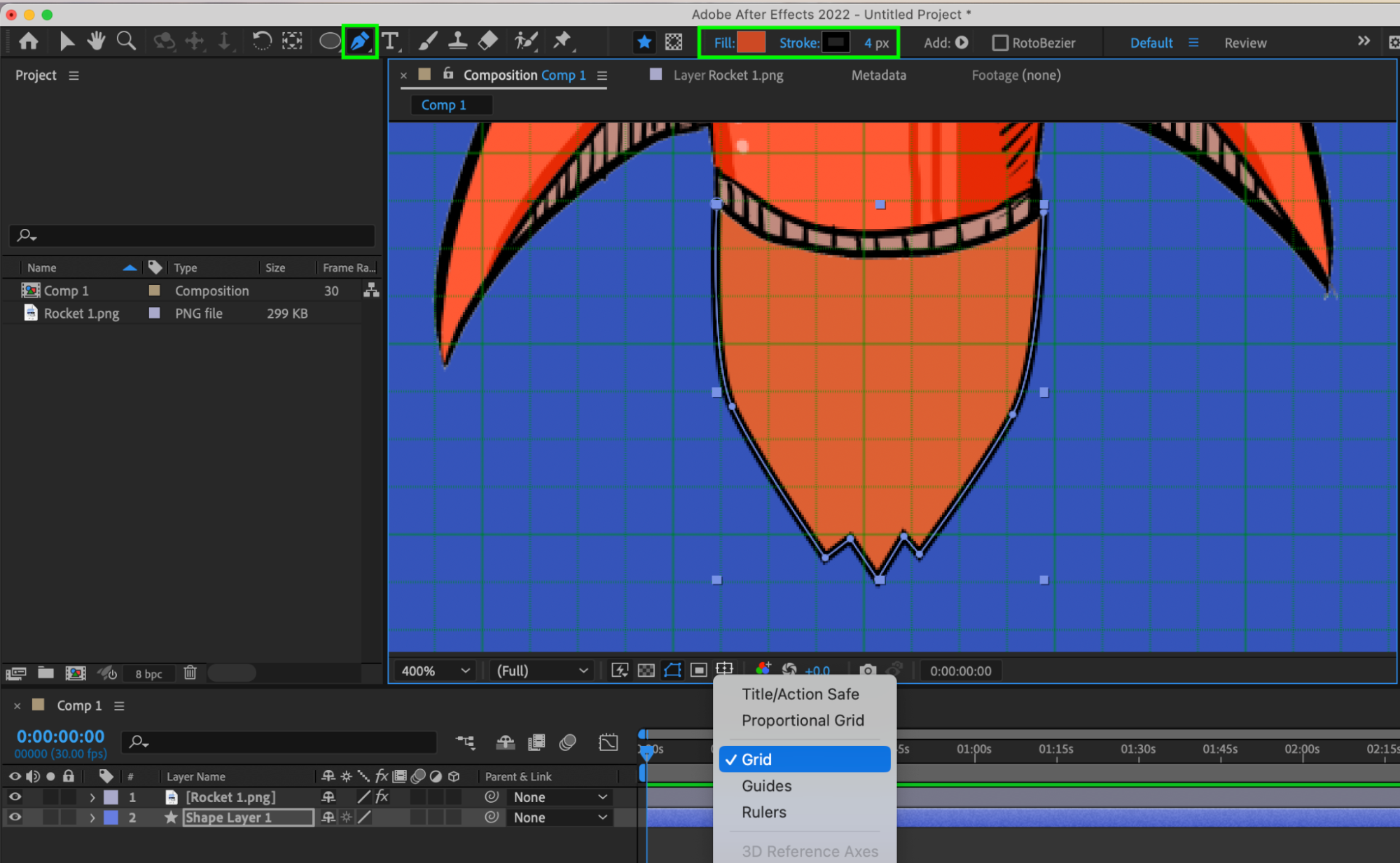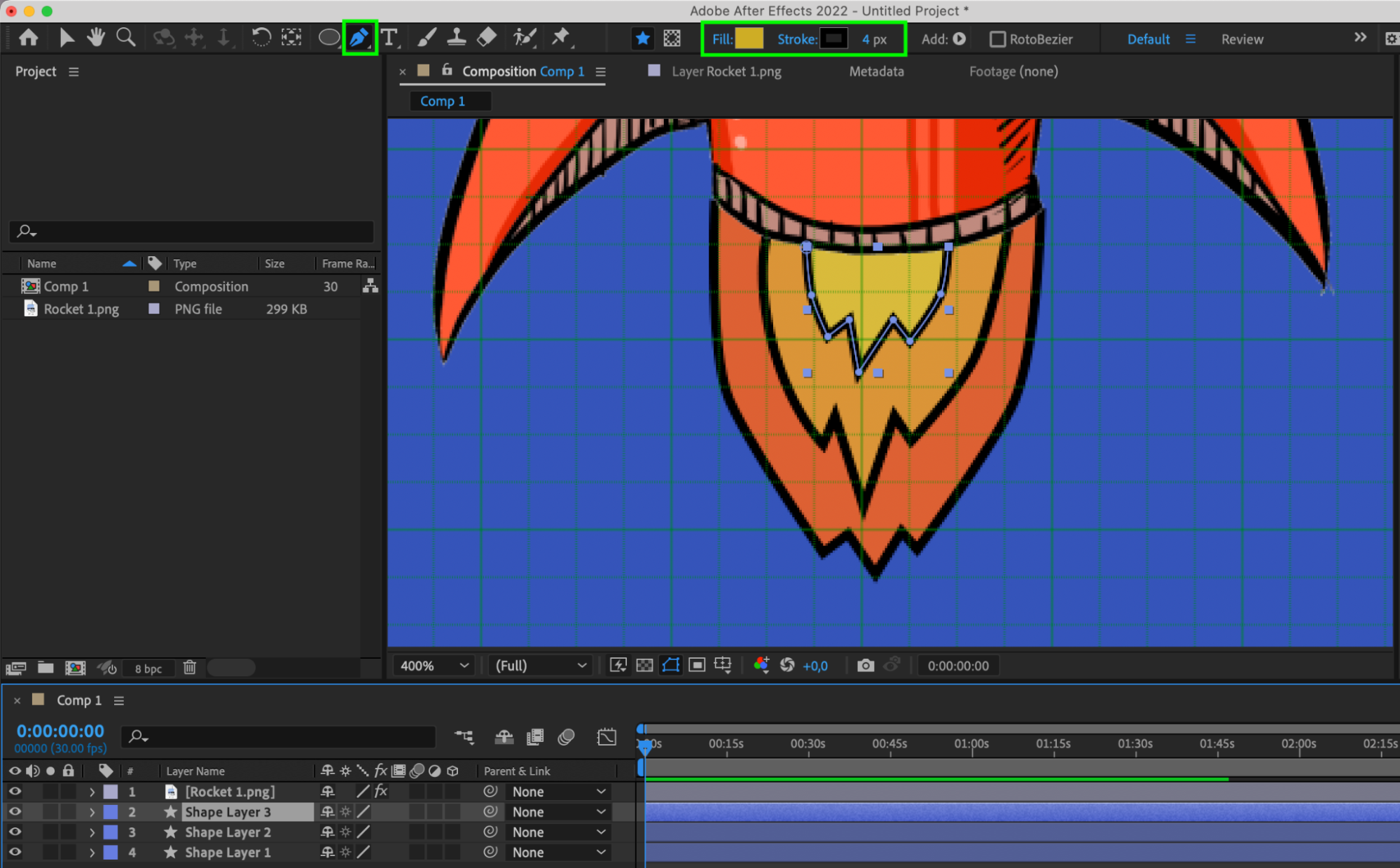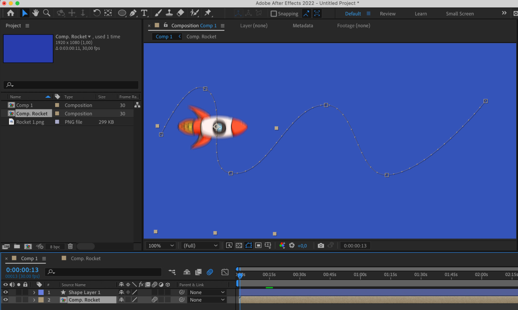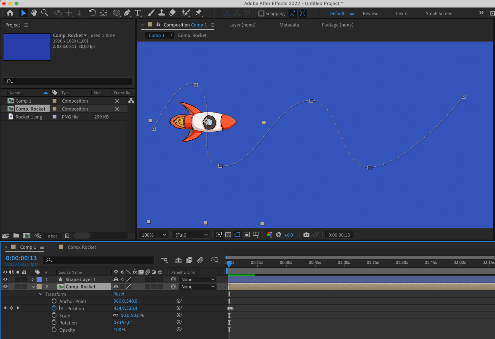 Import your files into the project and drag them onto the timeline panel to animate them. Alternatively, use the shape and pen tools to create objects directly within the composition panel.