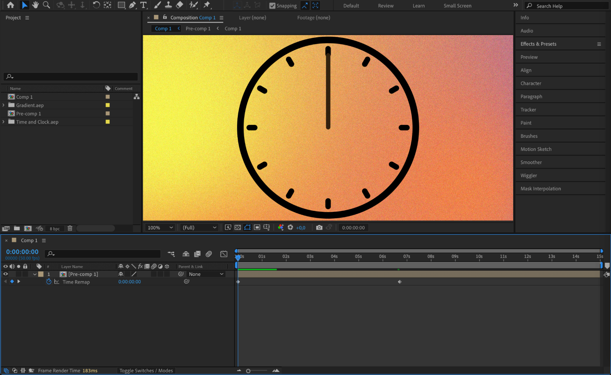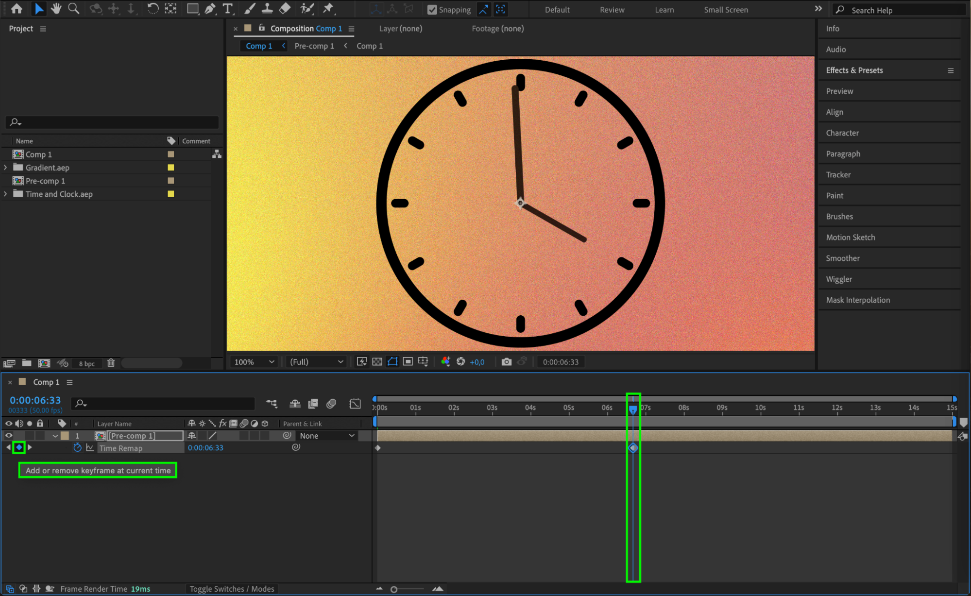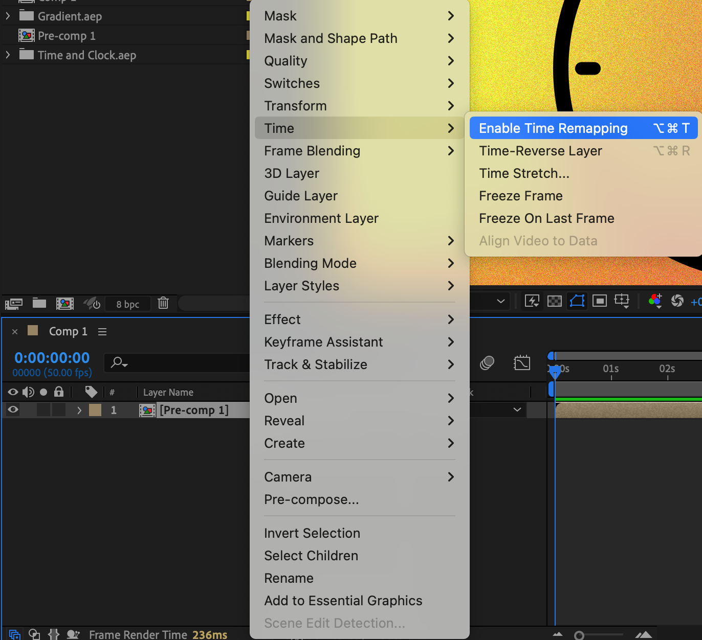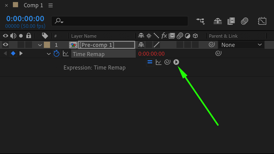 Right-click on the pre-composed layer and choose “Time” > “Enable Time Remapping”. This will automatically open the “Time Remap” parameter on the timeline with two keyframes created.