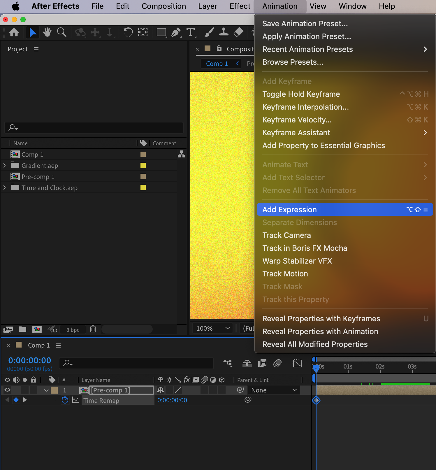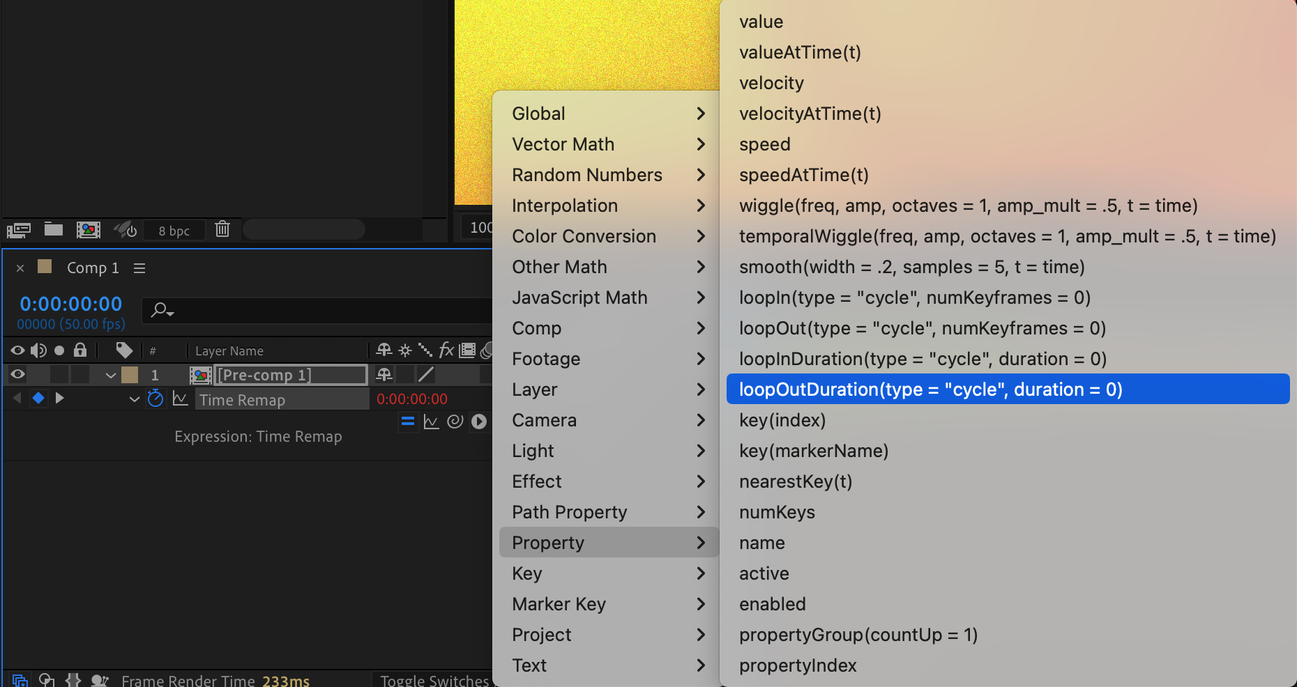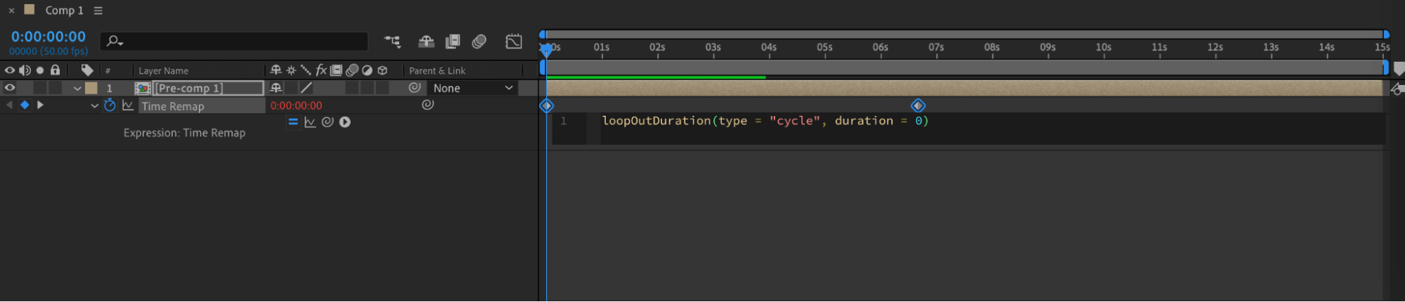 Select the “Time Remap” parameter, go to the top menu, choose “Animation” > “Add Expression”. Click the small triangle next to the “Time Remap” parameter and select “Property” > “loopOutDuration” from the submenu. This will add the loop expression to your timeline.