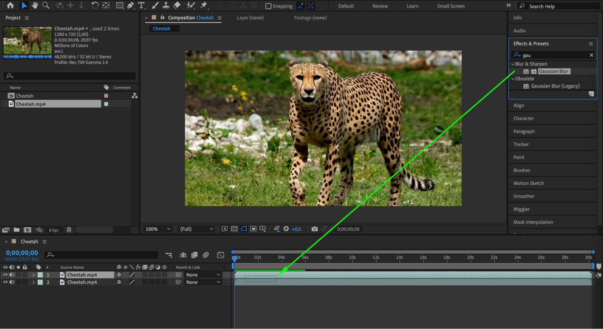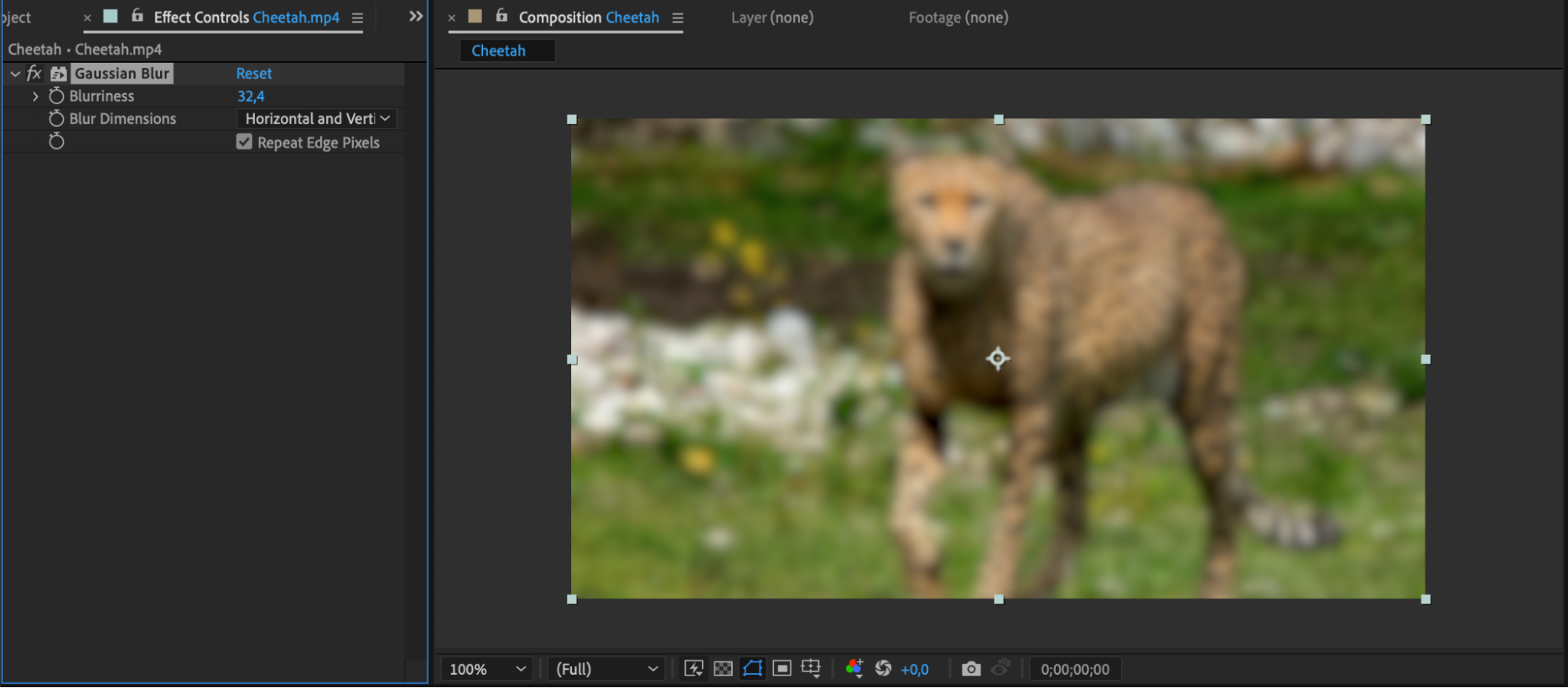 With the duplicated layer selected, navigate to Effect > Blur & Sharpen > Gaussian Blur. In the Effect Controls panel, adjust the Blurriness parameter until the background blur looks satisfactory. This will create the desired blur effect on the entire duplicated layer.