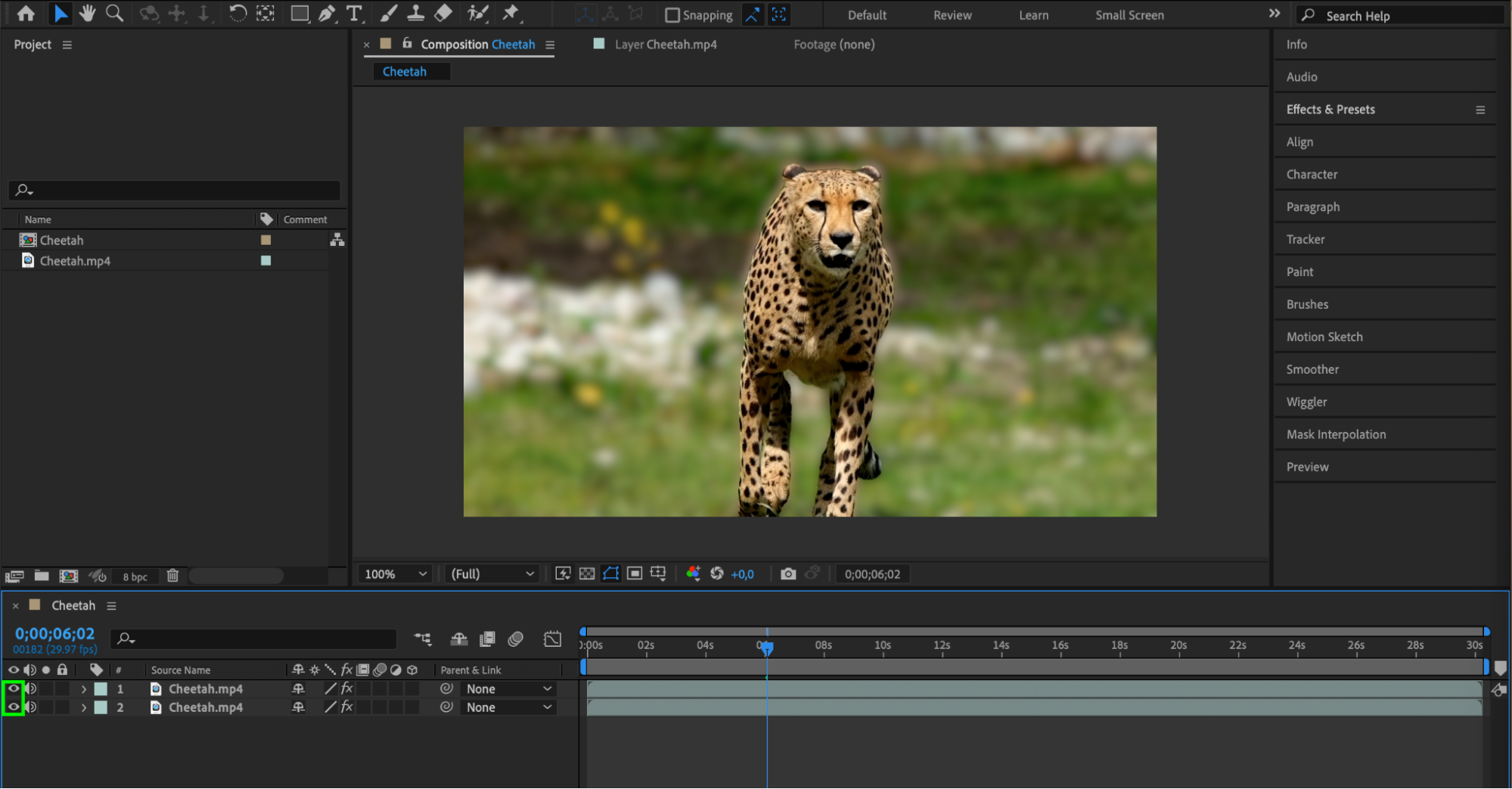 Make the duplicated layer visible again by clicking the eye icon next to it in the Timeline panel. Ensure that the duplicated layer is placed underneath the original layer in the layer stack. This setup ensures that the blurred background appears behind the focused subject.