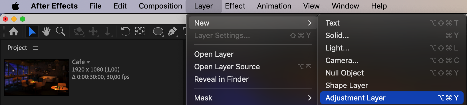 Next, create a new adjustment layer by right-clicking in the timeline panel and selecting “New > Adjustment Layer.” This layer will be used as the container for the black and white effect.