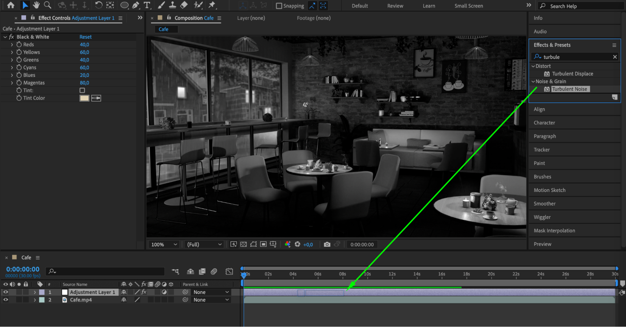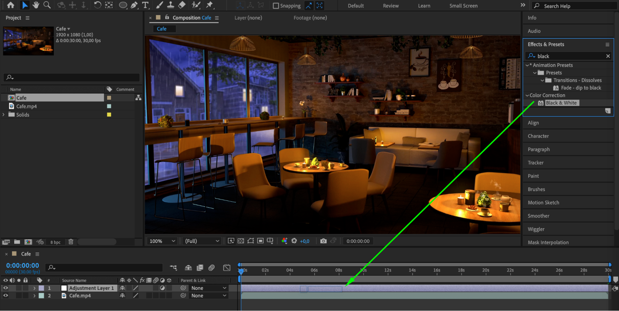 With the adjustment layer selected, go to the Effects & Presets panel and search for the “Black & White” effect. Drag and drop it onto the adjustment layer.