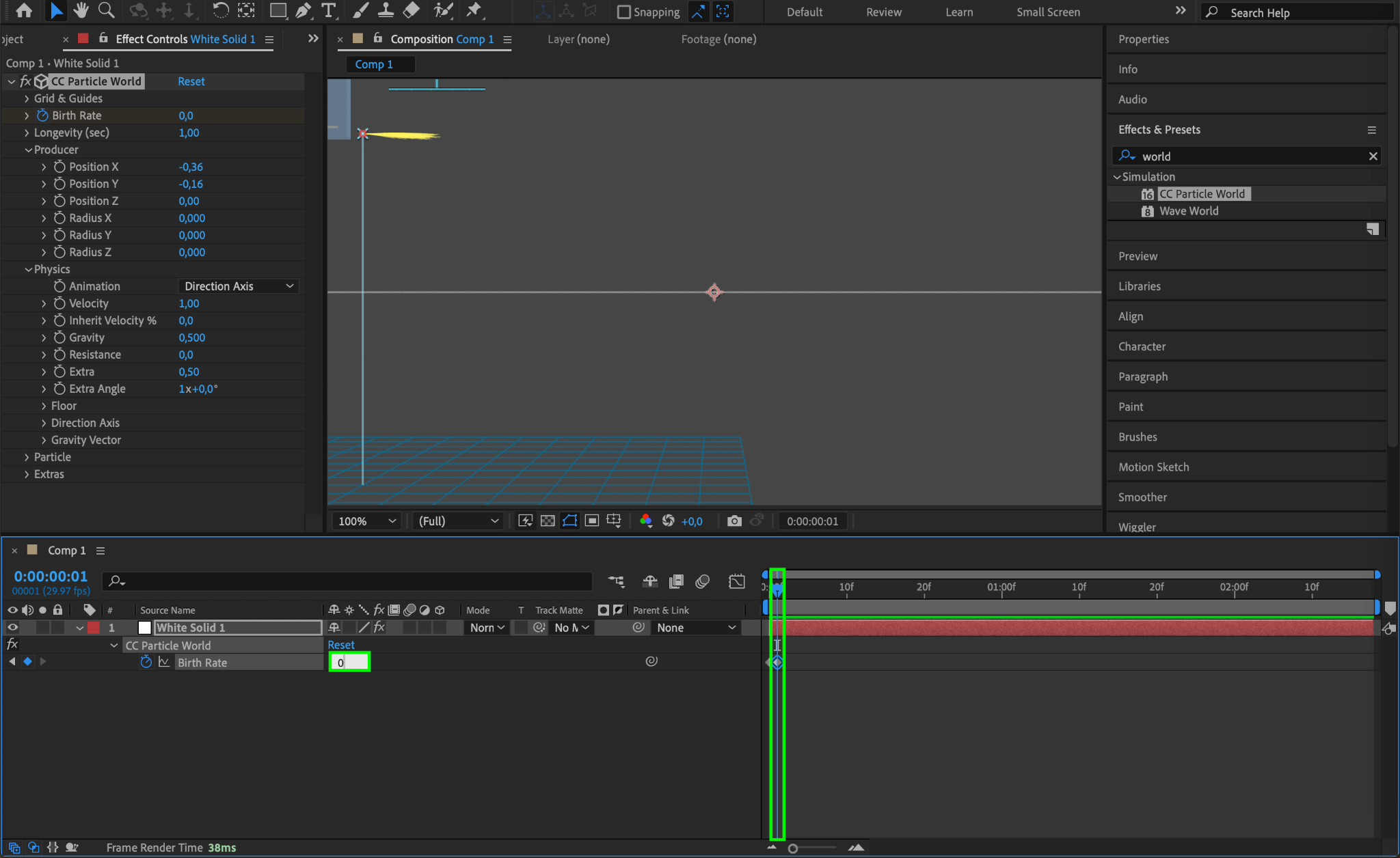 With your solid layer selected, go to “Effect” > “Simulation” > “CC Particle World.” This effect will allow you to generate and animate particles that will mimic the appearance of blood splatter.