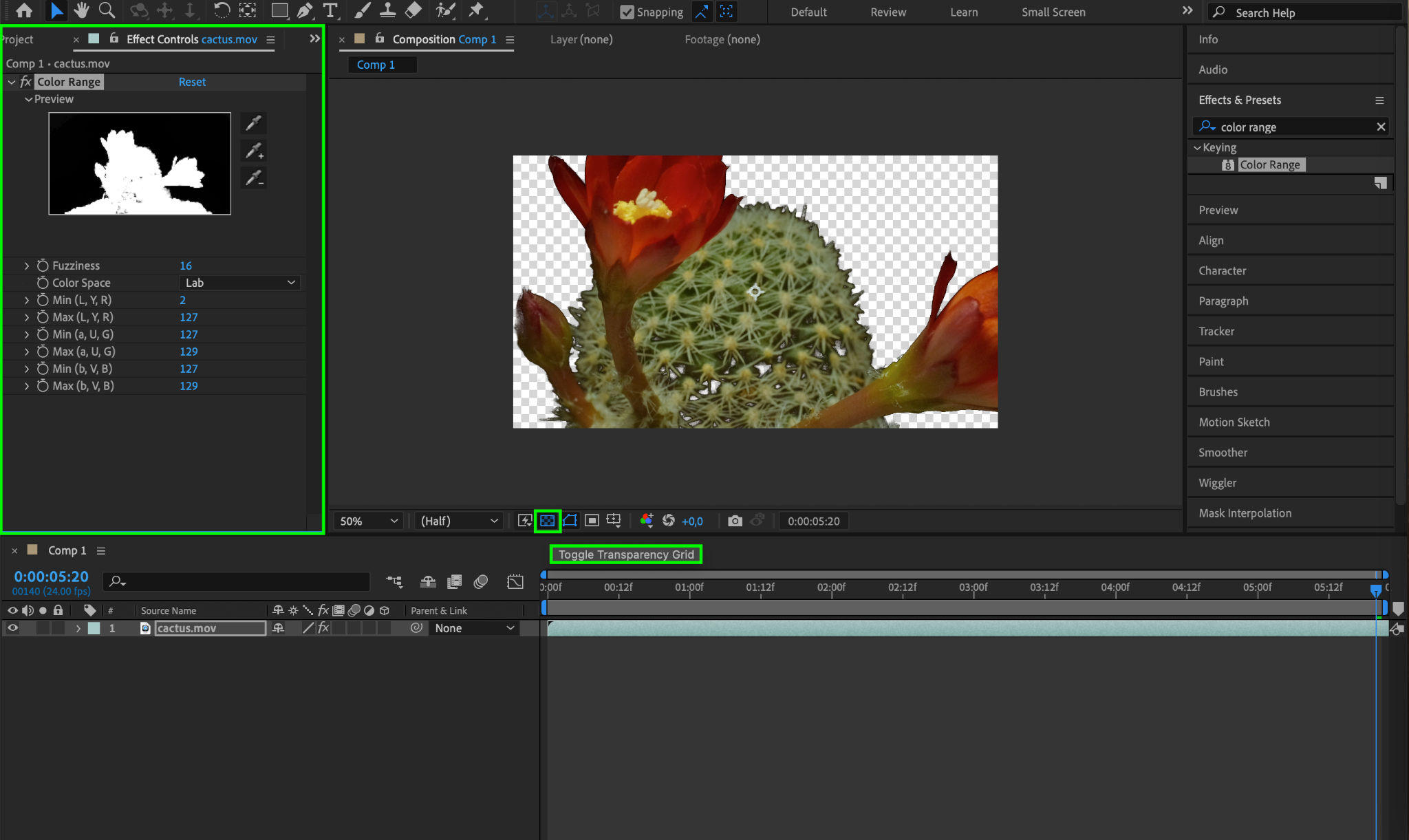 Step 6: Apply the keying effect to the video layer by dragging it onto the layer in the timeline. This will open the effect settings in the Effect Controls panel. Adjust the effect settings and ensure that the “Toggle Transparency Grid” button at the bottom of the composition panel is activated.