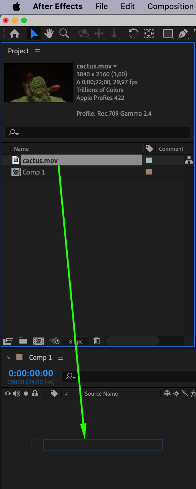 Step 2: Import your videos or assets into the composition. To do this, go to “File” and select “Import” to open the file browser. Locate your files and import them into your project. You can also drag and drop the files directly into the Project panel.