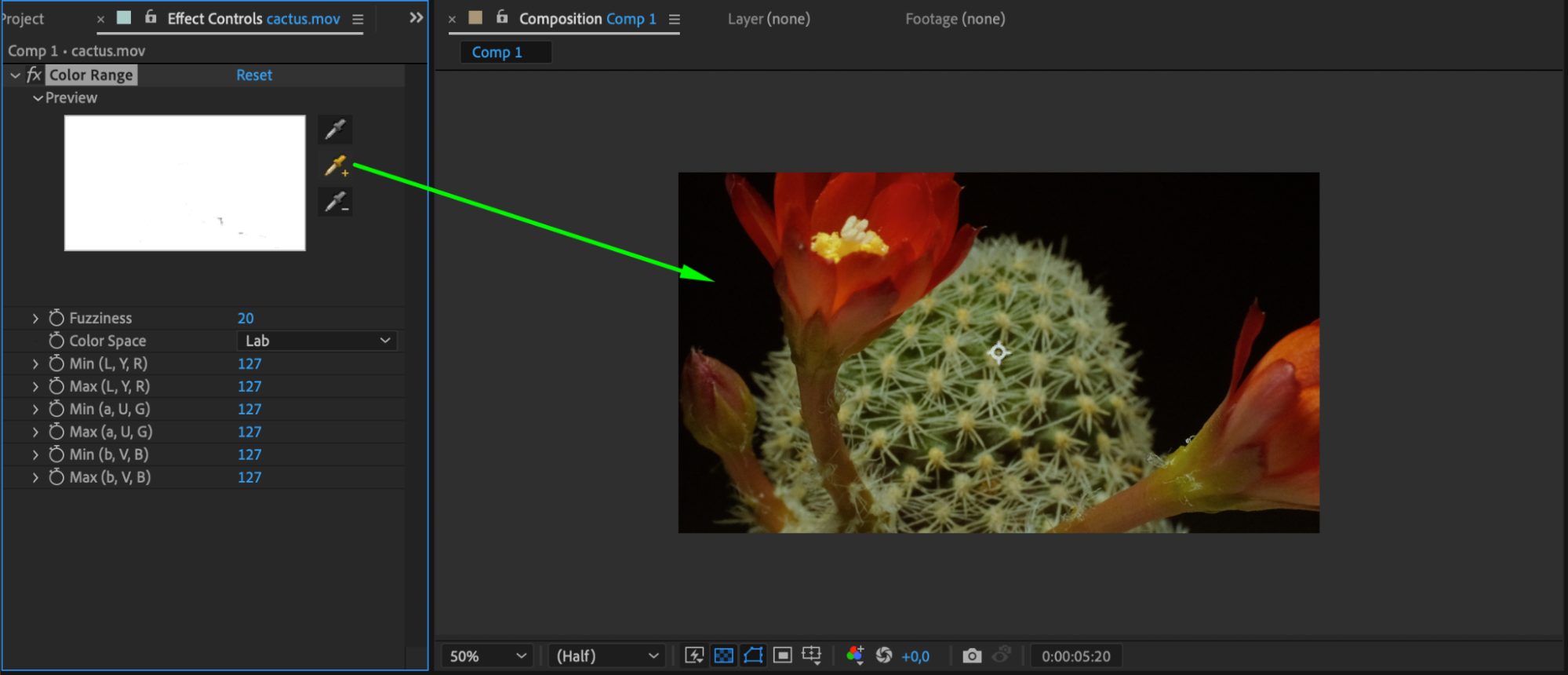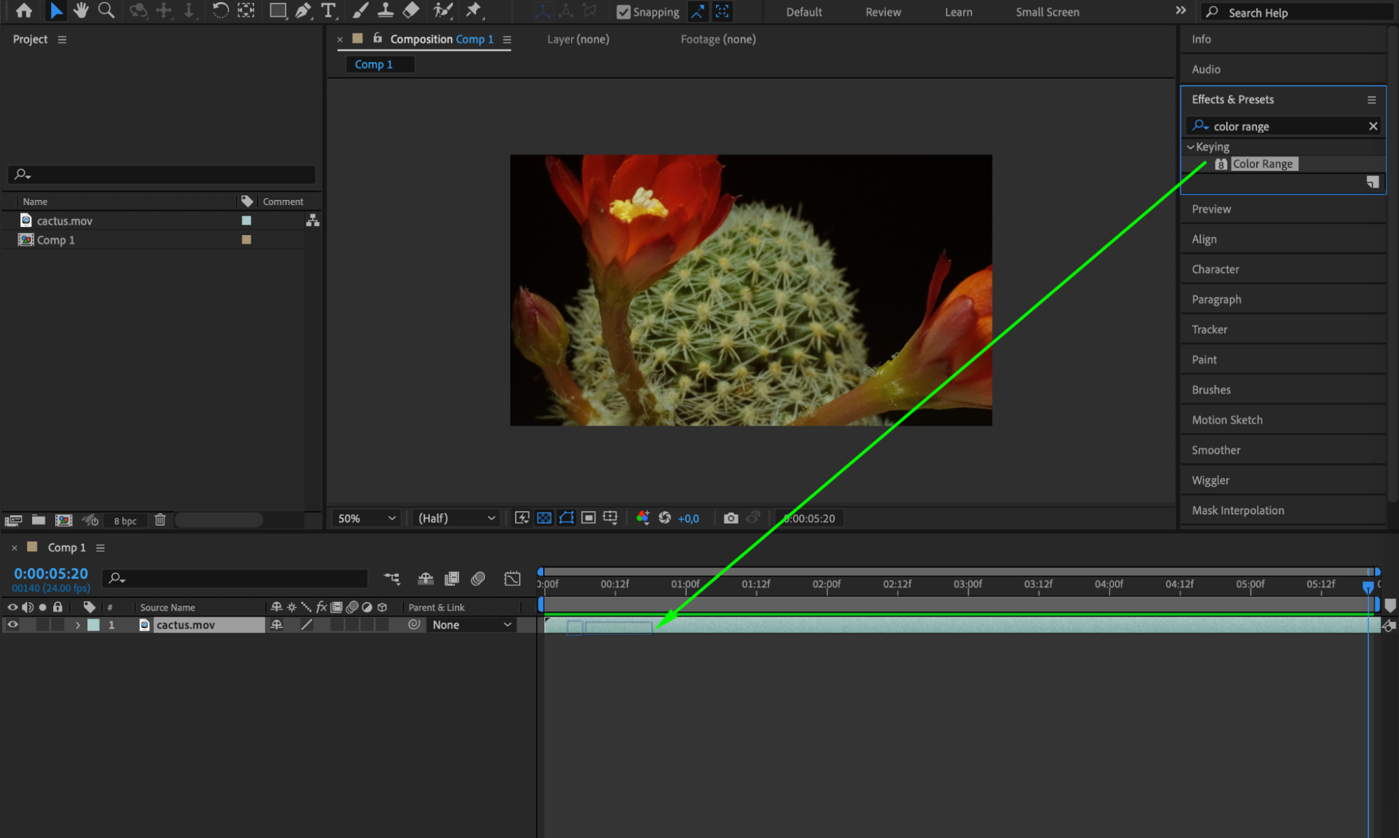 Step 5: Choose the appropriate keying effect based on your video footage. For example, if you have a green screen, you can use the “Keylight” or “Color Range” effect to remove the green background.