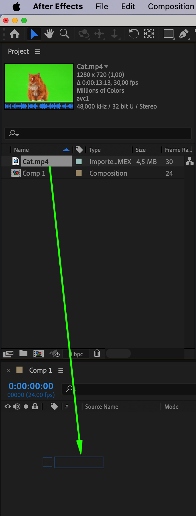 Drag the imported footage or object onto the timeline. This action will add the media to your composition, where you can now apply effects and make adjustments. Arrange it as needed within your composition to ensure proper placement.