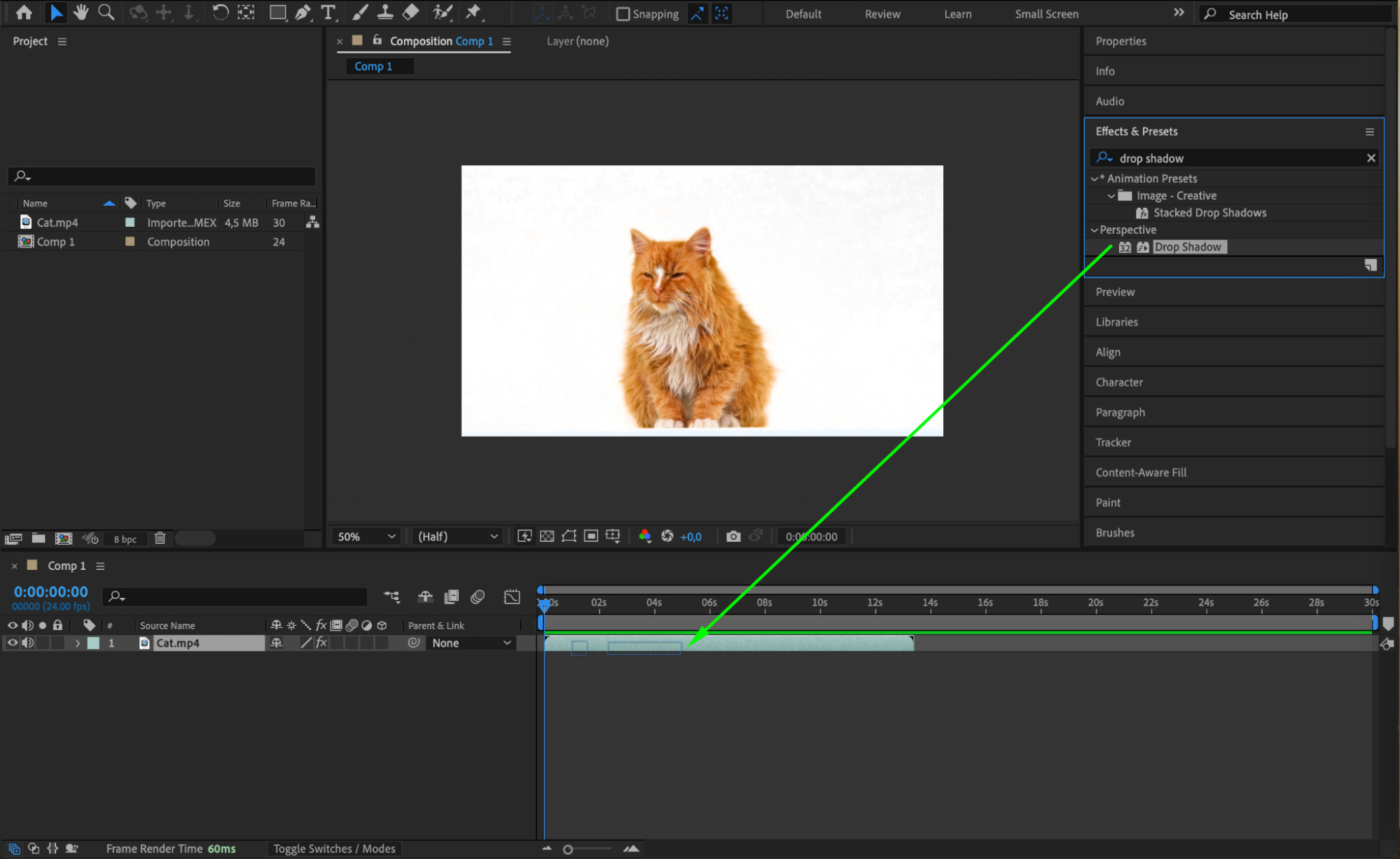Select the layer you want to apply the drop shadow effect to. Go to the Effects & Presets panel and search for Drop Shadow. Drag the Drop Shadow effect onto your selected layer. This will apply the effect and enable you to customize its appearance.