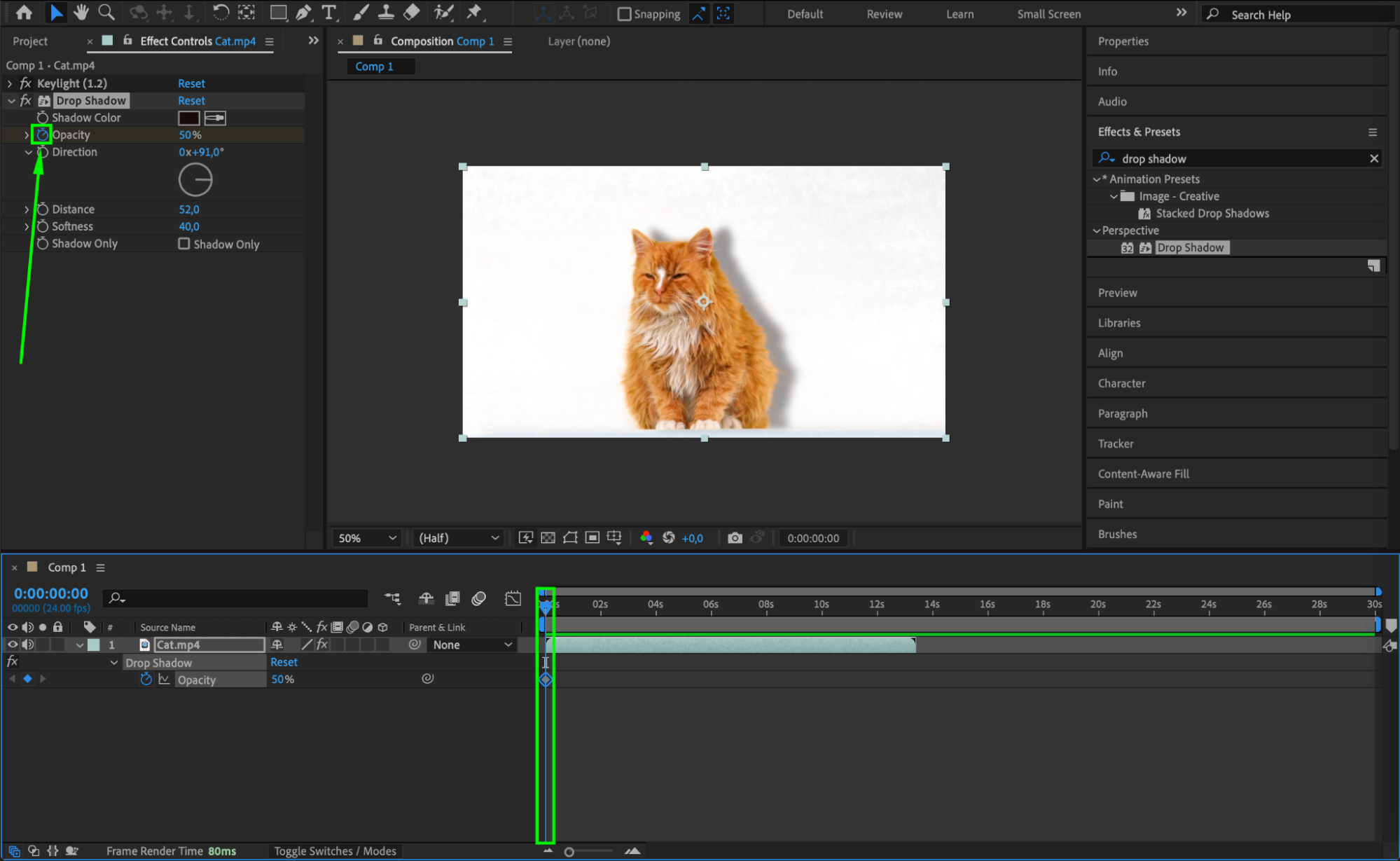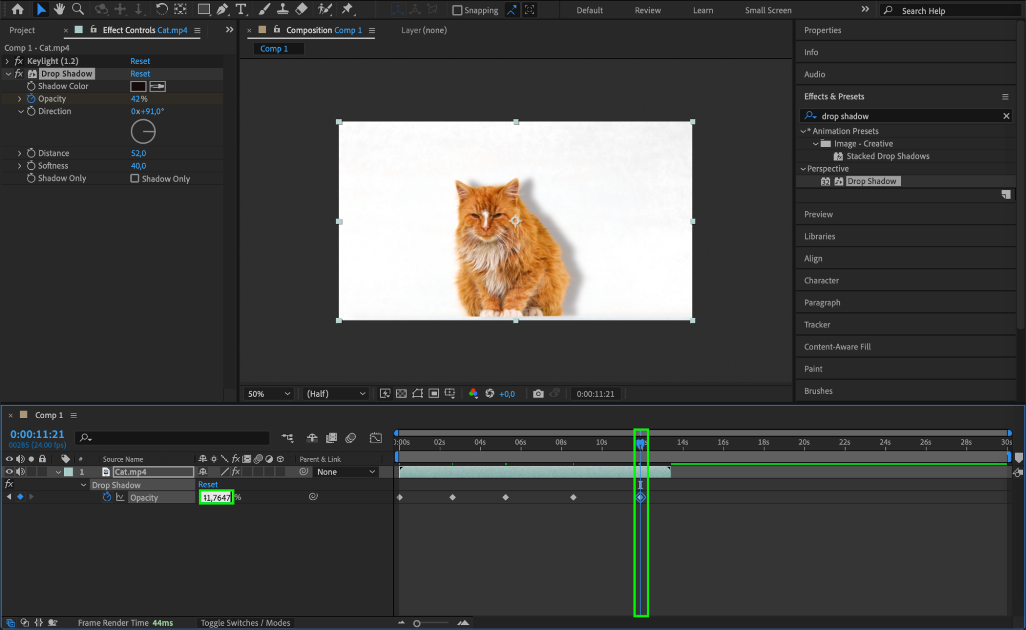 For added realism, you can animate the drop shadow effect. Adjust parameters such as opacity and distance over time using keyframes. This can simulate effects like moving light sources or changing shadow intensity, making your animation more dynamic.