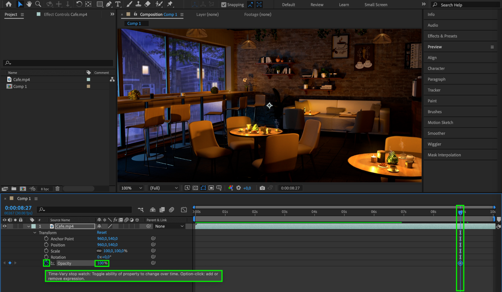 Move the Current Time Indicator (CTI) to the point in the timeline where you want the fade-out effect to begin. Set the initial opacity to 100% to ensure your media is fully visible at this point. Click the stopwatch icon next to the Opacity property to create the first keyframe.