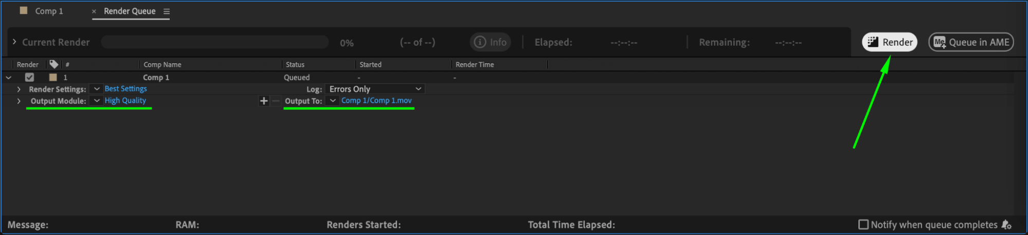 If you’re satisfied with the result, render the composition by going to the Composition > Add to Render Queue. In the Render Queue panel, choose your desired output settings, such as file format and destination, and click “Render.”