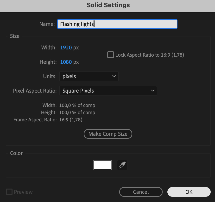 Create a solid layer, adjust settings, and choose a white color. Rename it to “Flashing Lights.”