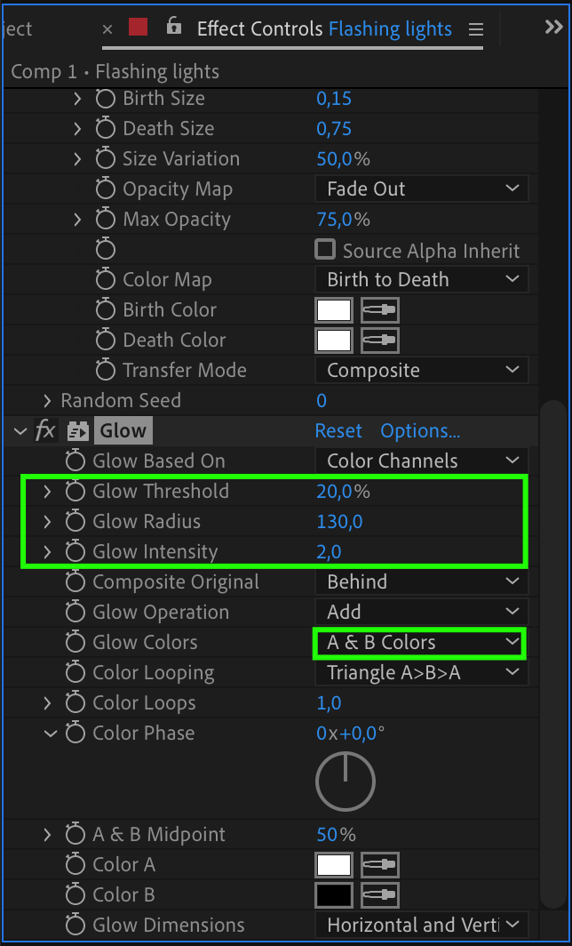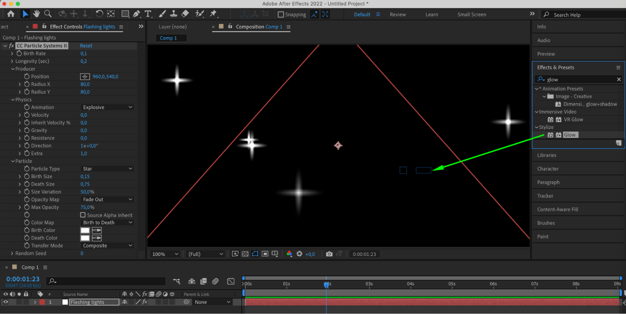 Locate the Glow effect in the Effects & Presets panel and apply it to the “Flashing Lights” layer.