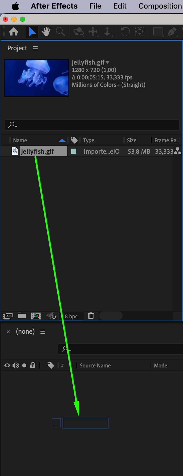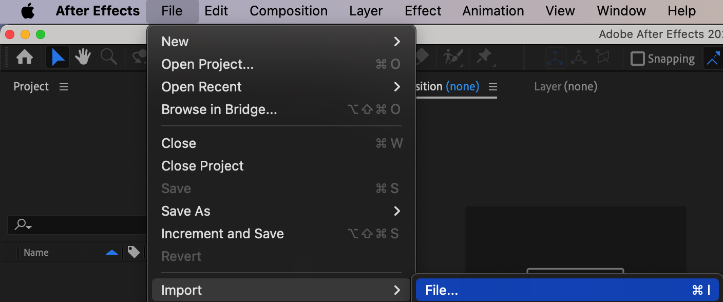 Start by importing the GIF you want to create a GIF loop from. Go to the File menu, select Import > File, and choose your file. Once your file appears in the Project panel, drag it onto the Timeline panel. This will automatically create a new composition with the same settings as your file, allowing you to quickly start editing.