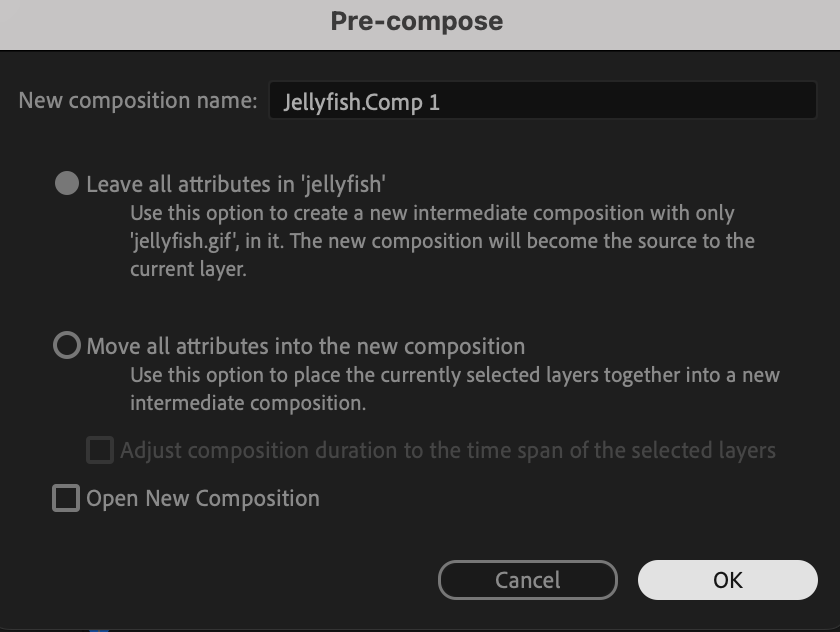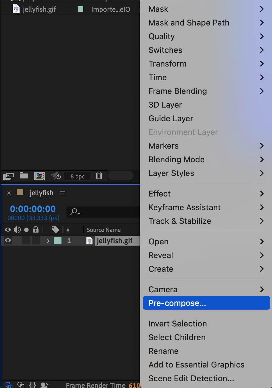 Once your file is on the Timeline, right-click on the selected layer and choose Pre-compose. Give it a meaningful name.