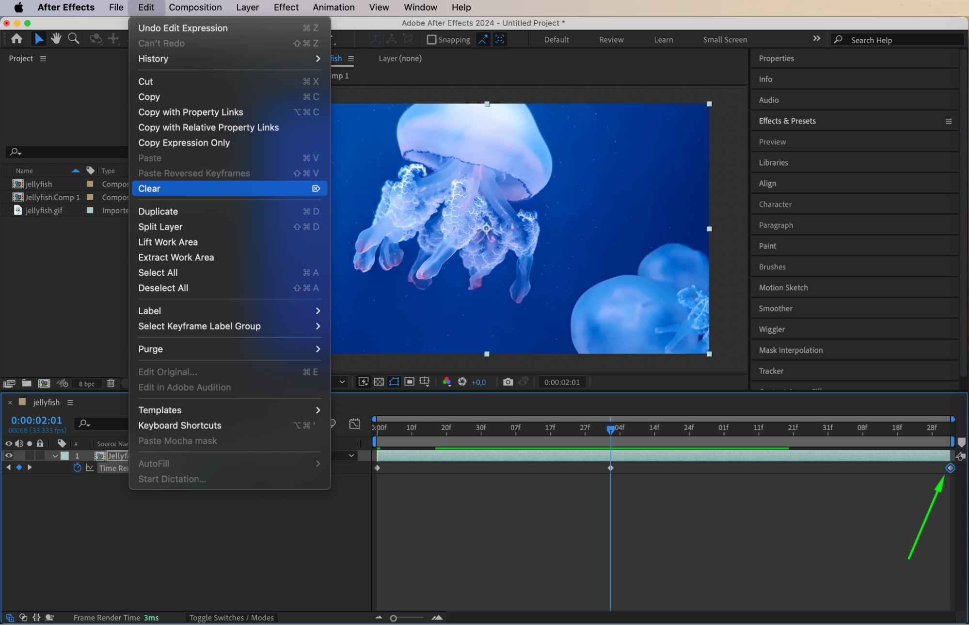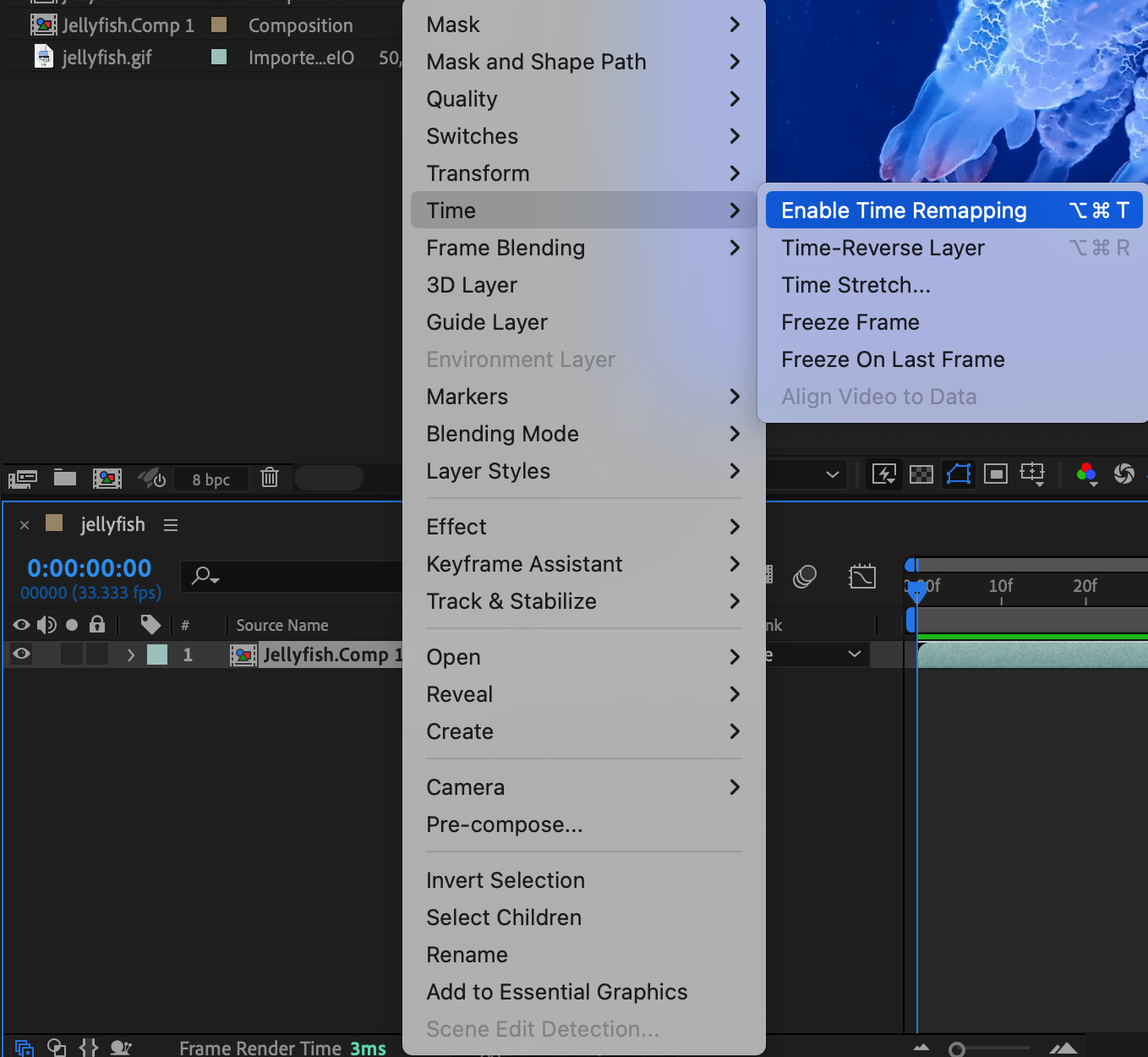 With the pre-composed layer selected, right-click on it, go to Time, and select Enable Time Remapping. Enabling time remapping gives you control over the timing and duration of your animation, which is essential for creating a smooth loop.