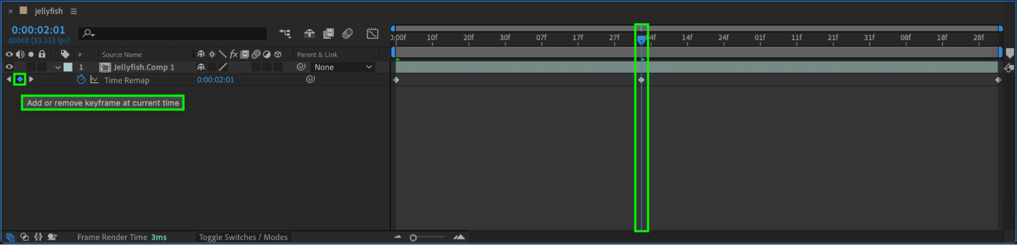 To define the point where you want your GIF to loop, place the Current Time Indicator at the desired position in the Timeline. Click the diamond-shaped icon next to the Time Remap parameter to create a keyframe. This keyframe marks the start of the loop. Delete the second keyframe that was automatically created to ensure your loop starts and ends at the correct points.