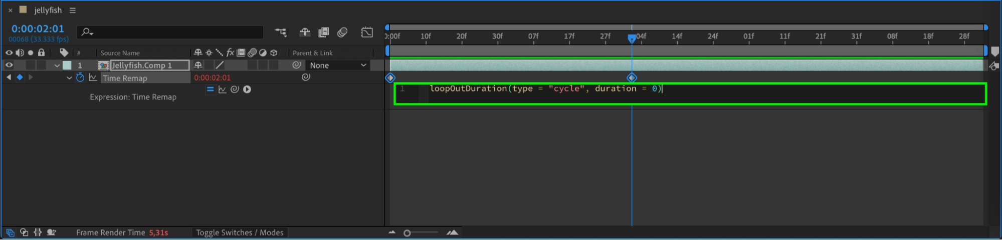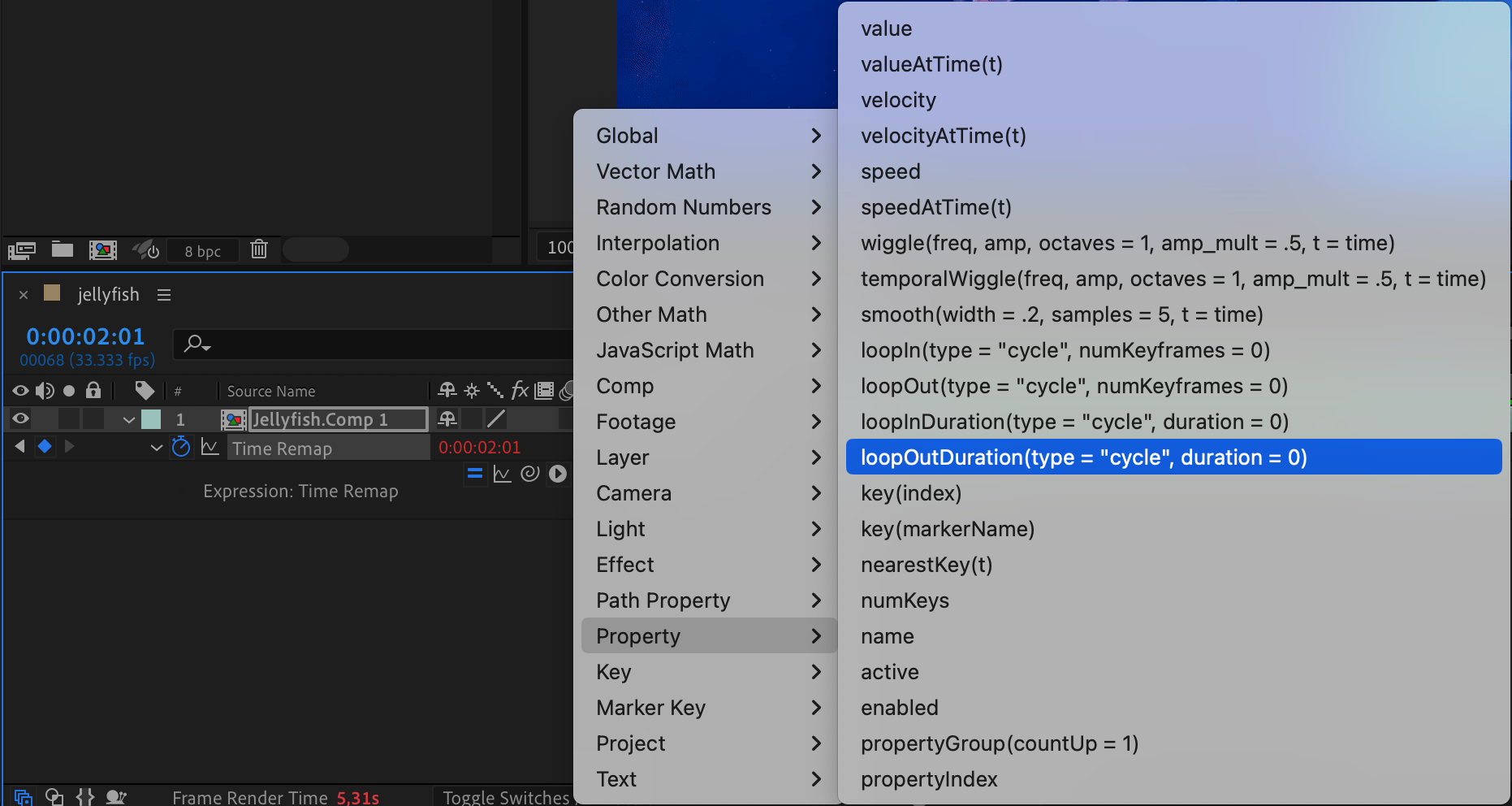 To make your animation loop seamlessly, you’ll need to add an expression to the Time Remap property. Click on the Time Remap parameter, then go to the Animation menu and select Add Expression. Click the small arrow next to the expression input box, choose Property > loopOutDuration from the menu. Press Enter to apply the expression. This expression will ensure your animation loops continuously.
