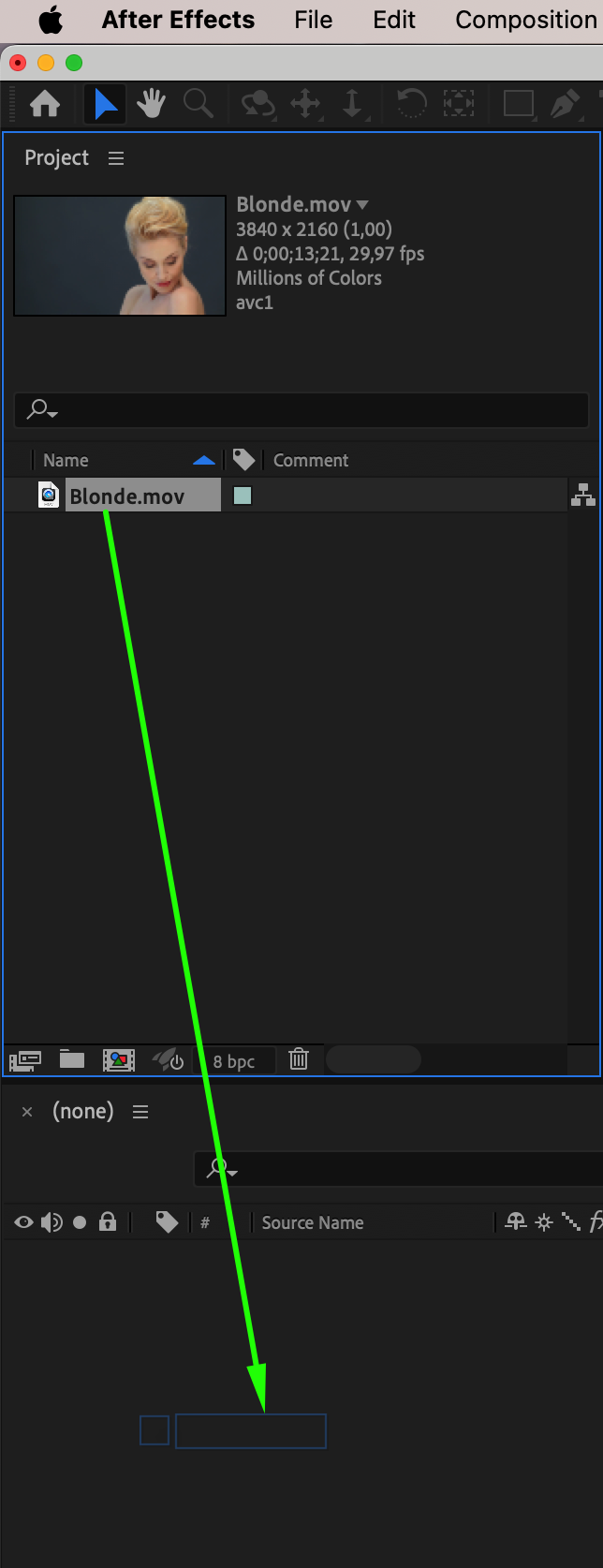 Go to File > Import > File, and select your video or image. Drag it onto the timeline to create a new composition. Choose footage where the subject’s eyes are visible and unobstructed for best results.