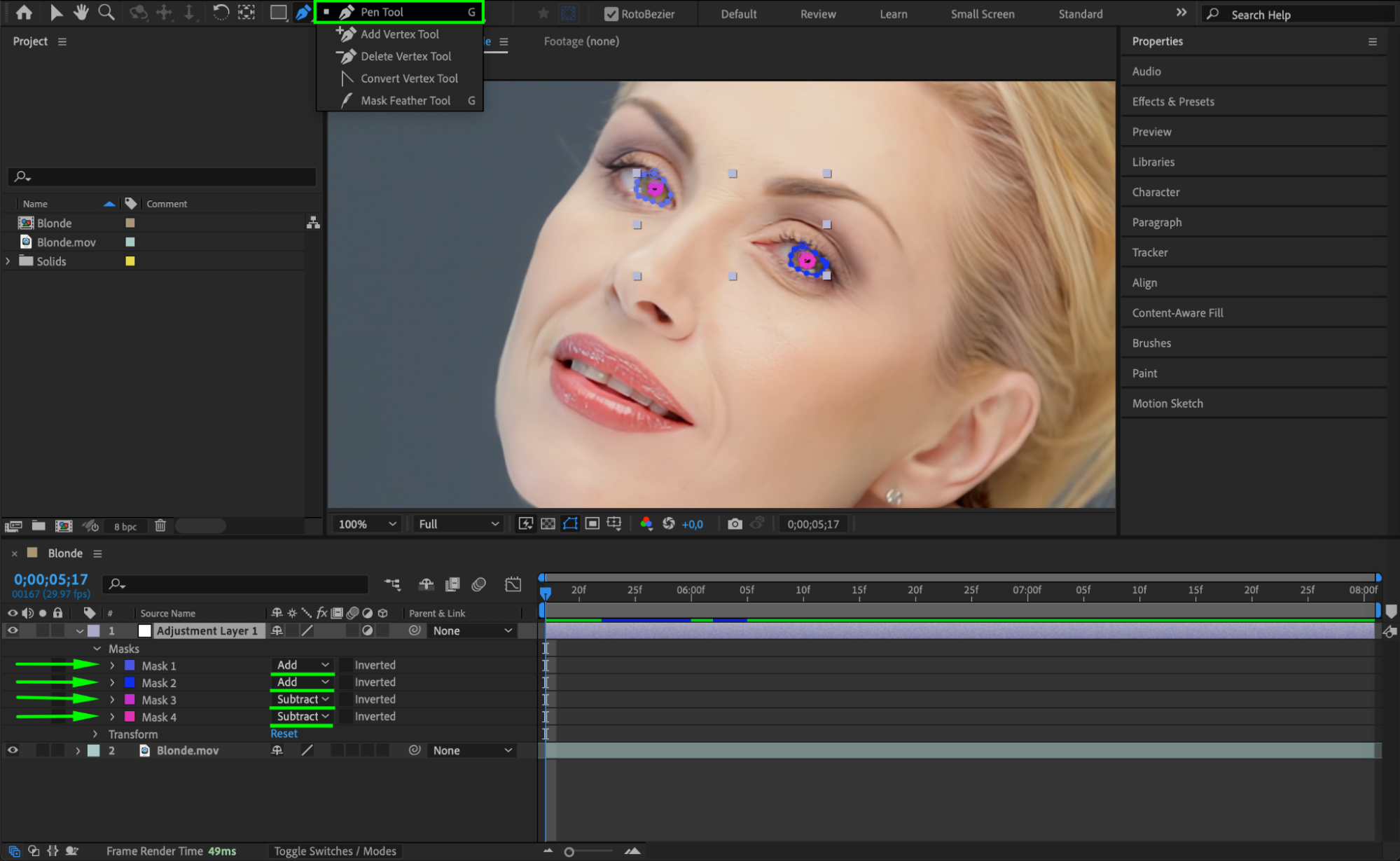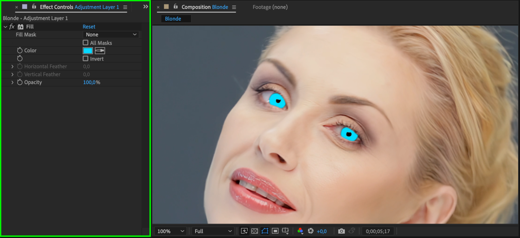 If your subject blinks or moves, animate the Mask Path keyframes over time to match the motion. For more accurate tracking, you can use the Tracker Panel to track the eye movement and apply the data to a null object, then parent the adjustment layer or masks to that tracking data.
