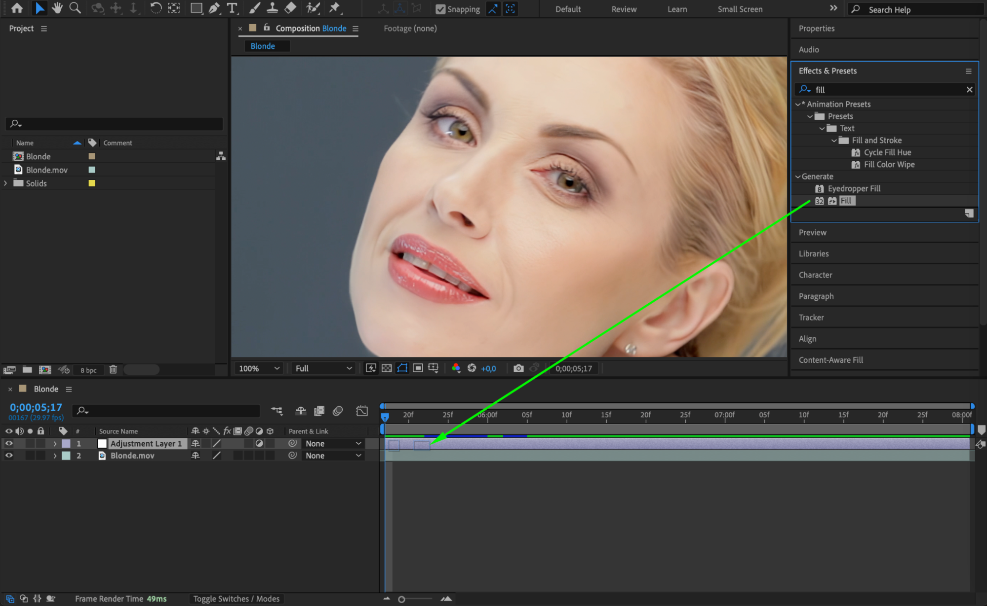From the Effects & Presets panel, drag the Fill effect to the adjustment layer. Pick a color for the glow – commonly neon blue, red, or white for a powerful look. This base color will influence the glow.