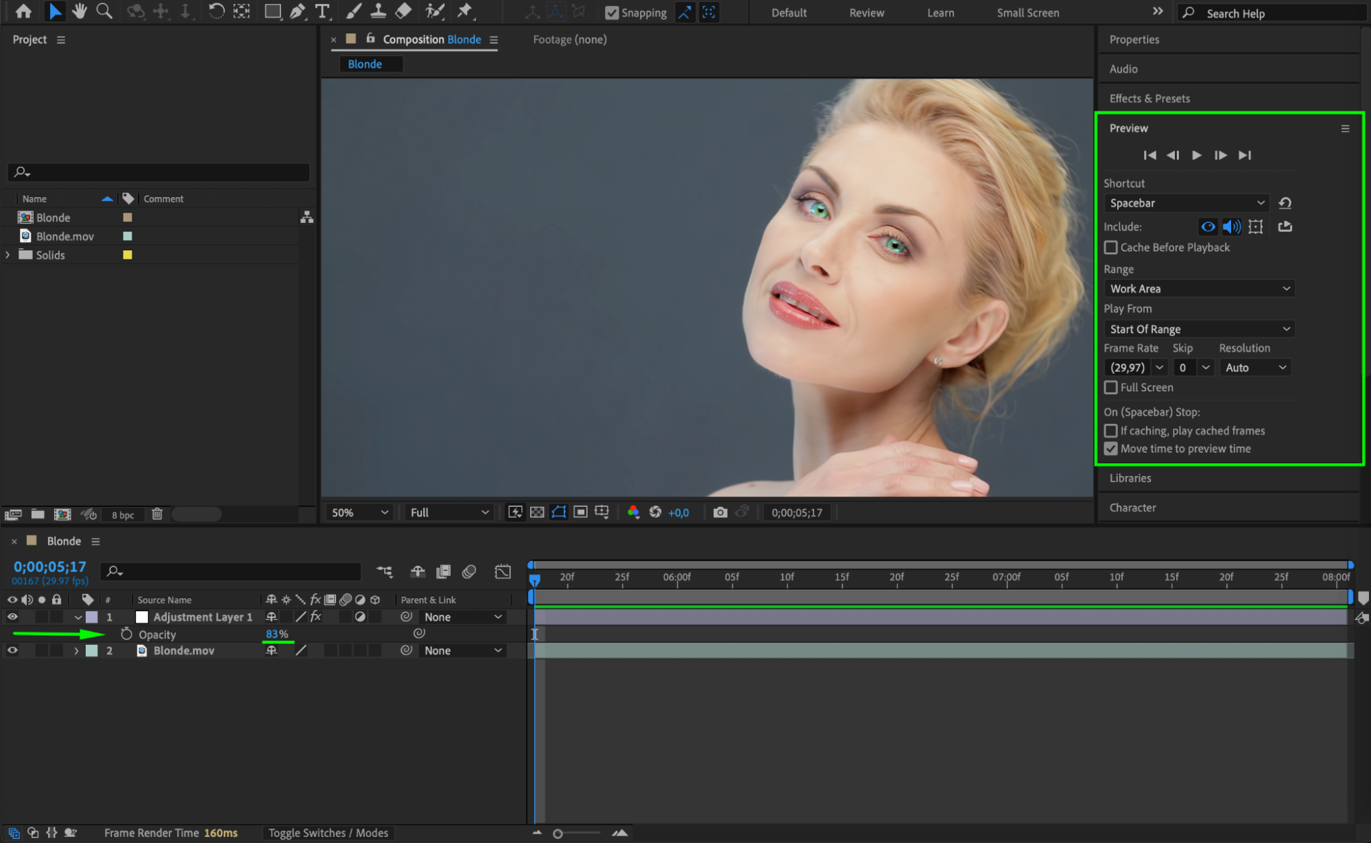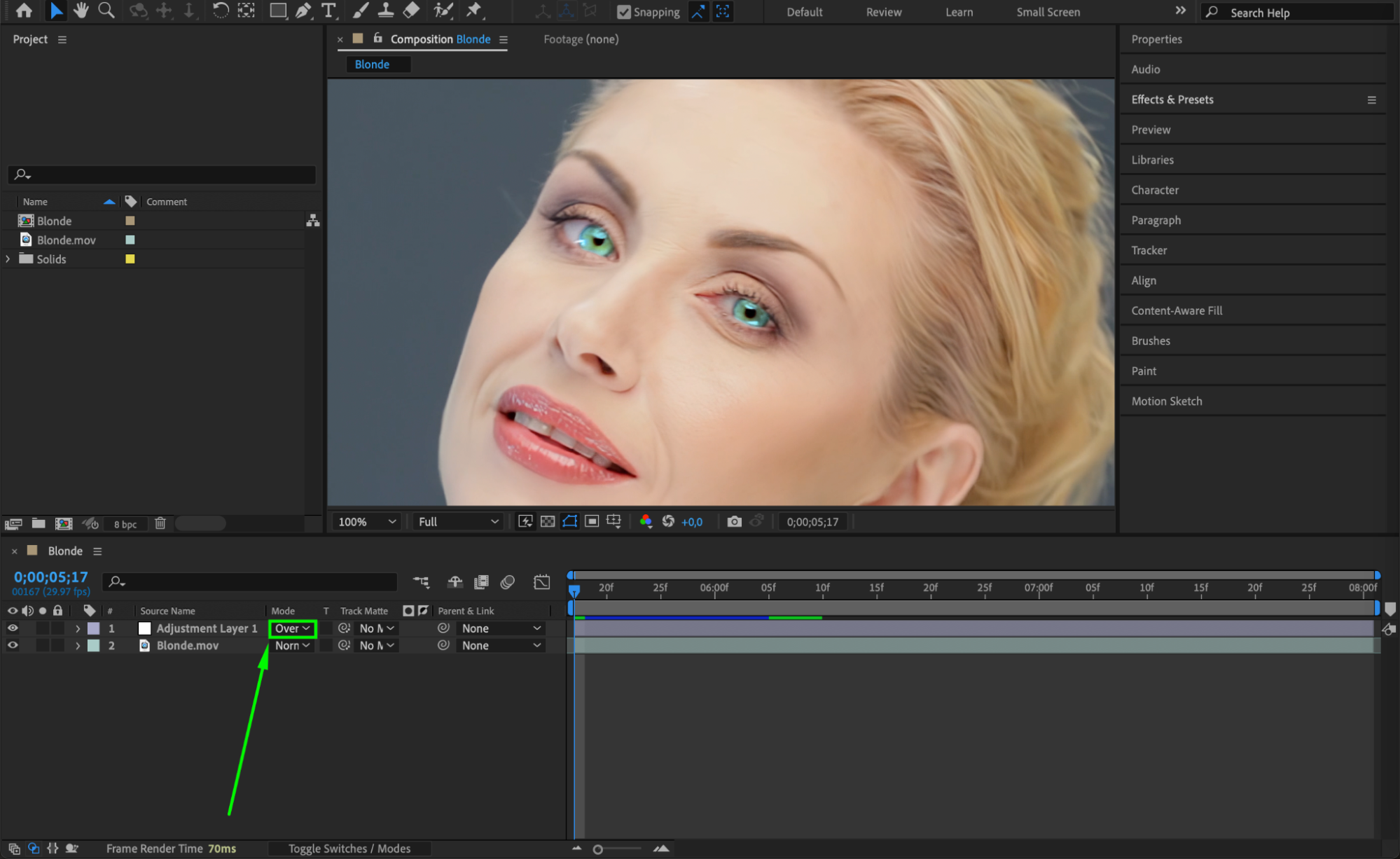 Right-click the adjustment layer, go to Blending Mode, and choose Overlay. This helps the glow blend more naturally with the skin tones and lighting in the footage.
