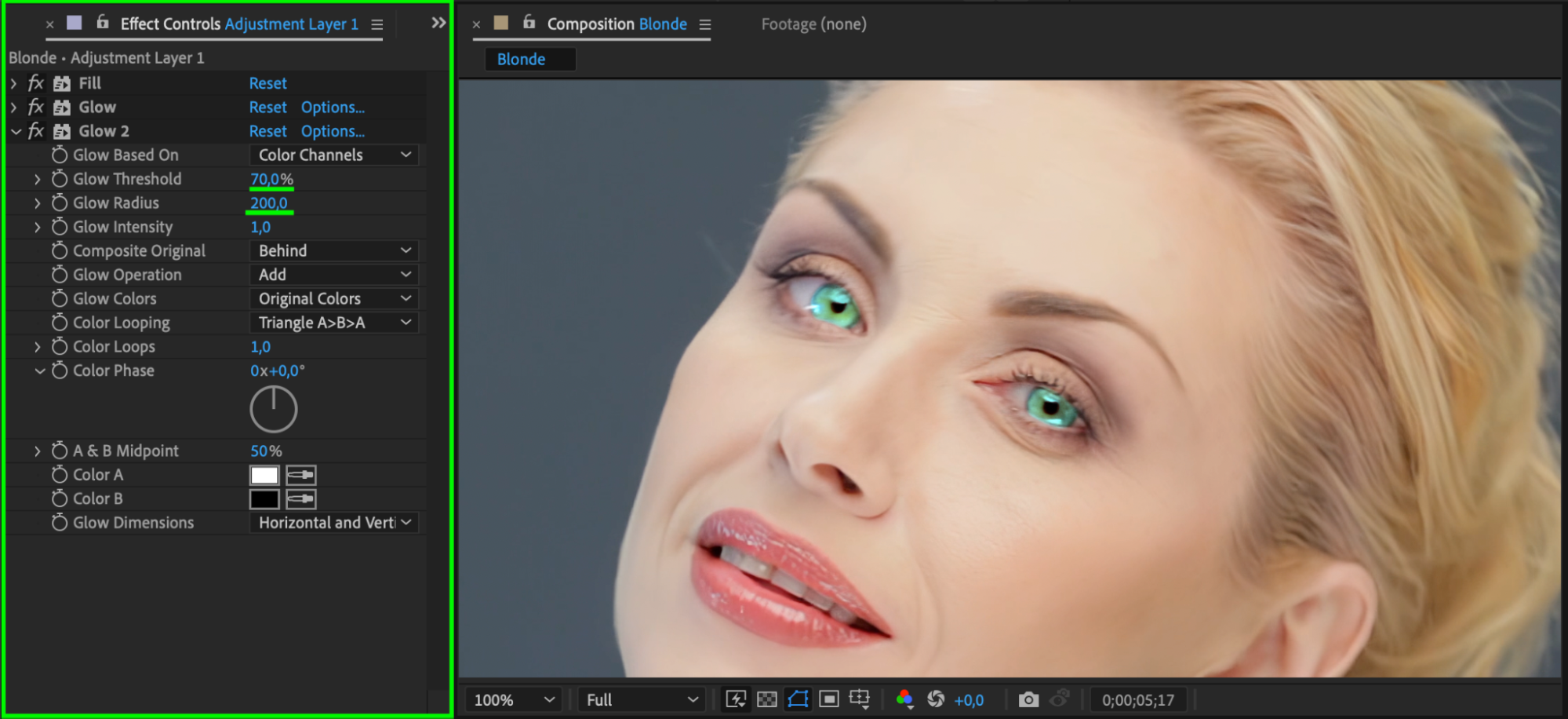 Drag the Glow effect onto the adjustment layer again. This time, set the Glow Threshold to 70 and the Glow Radius to 200. The large radius creates a soft, diffused glow that makes the eyes look more intense and supernatural.
