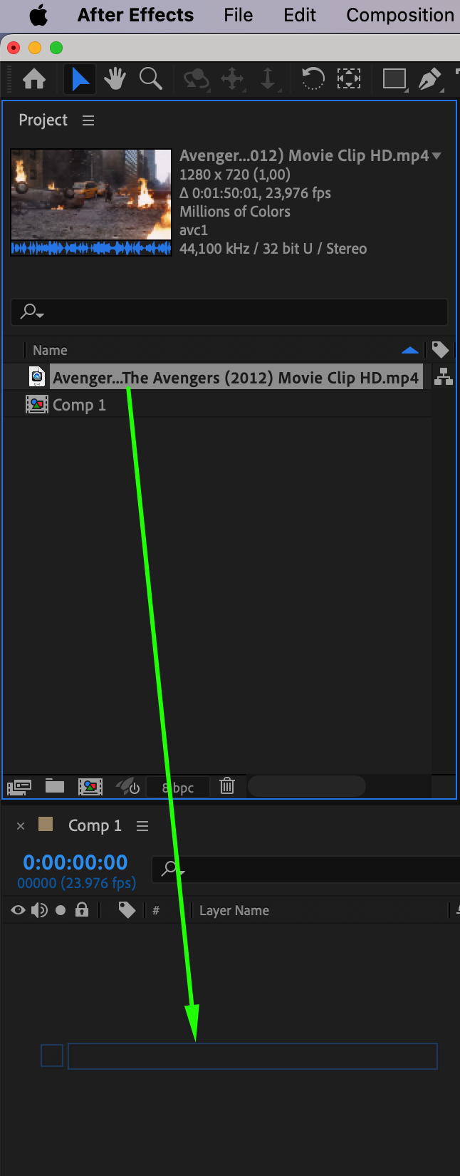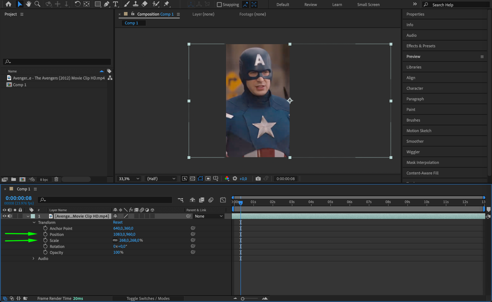Once your footage is on the Timeline, you may need to adjust how it fits within the composition frame. To do this, expand the video layer’s properties by clicking the small arrow next to the layer name. Then, under the Transform section, use the Scale and Position properties to resize and reposition your footage, making sure it fits properly within the frame. This step is essential for maintaining a polished look, especially when working with footage in different resolutions or aspect ratios.