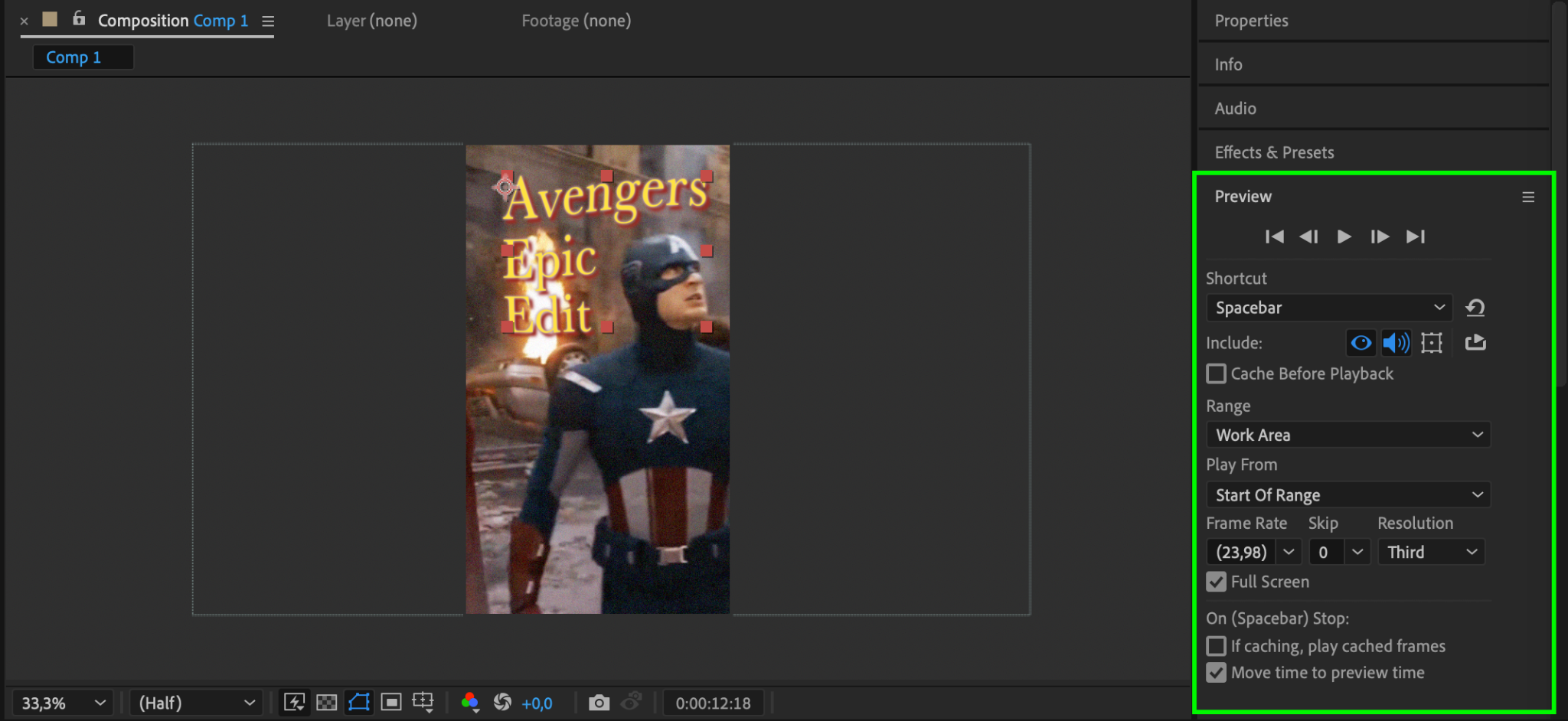Before rendering, preview your entire composition to ensure everything looks good. Press Spacebar to play through your edit and check for any mistakes or areas that need adjustment. You can also adjust the Work Area in the Timeline to focus on specific sections if needed. Make any necessary changes to effects, timing, or transitions before finalizing your project.