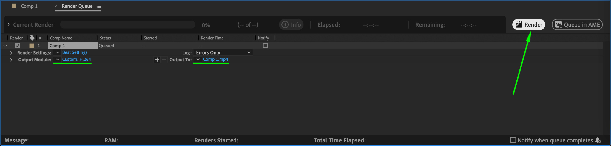 Once you’re satisfied with your Instagram edit, it’s time to export. Go to Composition > Add to Render Queue. In the Render Queue, adjust the Output Module settings, choosing H.264 as the format for Instagram-ready videos. Once your settings are correct, click Render to export the video.