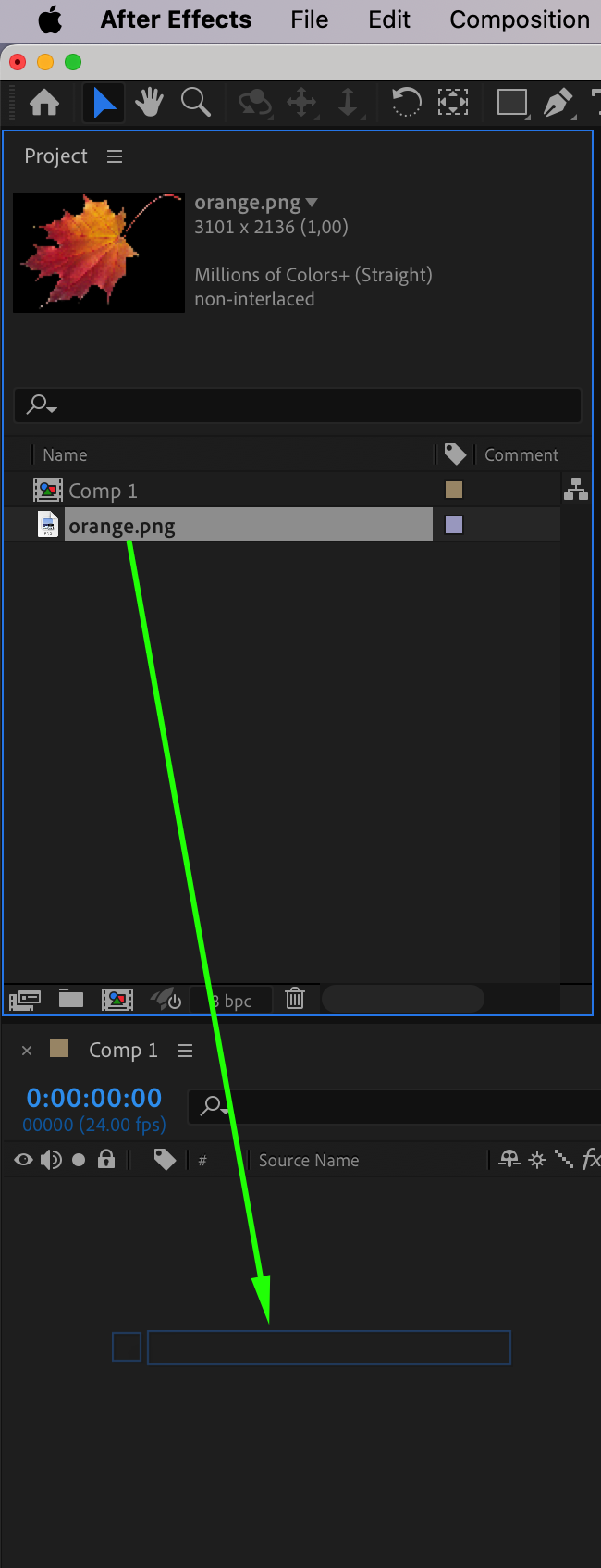 Import an image of a leaf into your project by going to File > Import > File. Drag the leaf image from the Project panel onto the timeline. This image will act as the texture for the particles that simulate falling leaves.